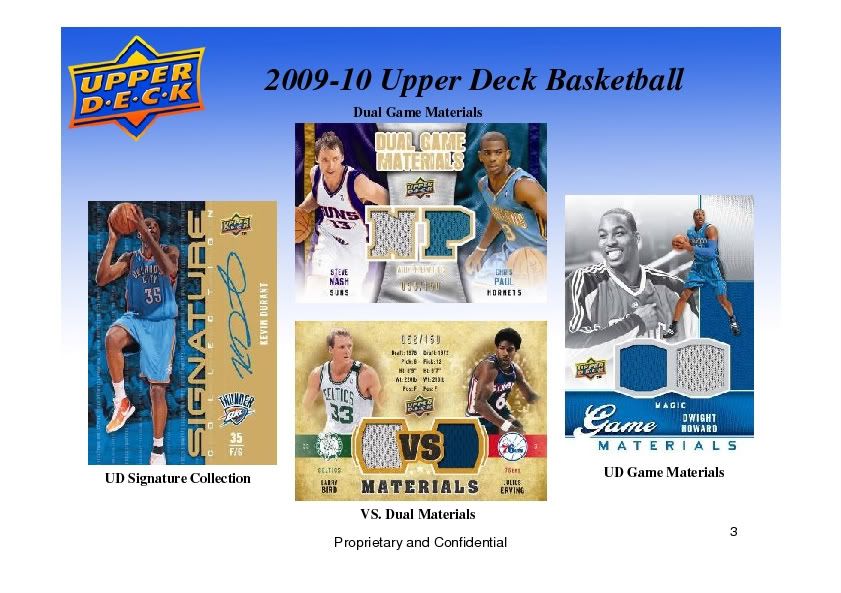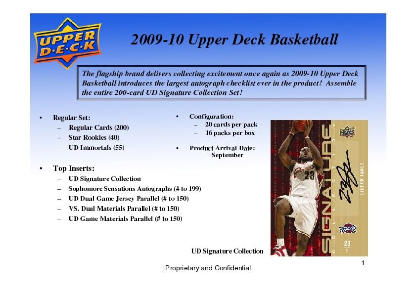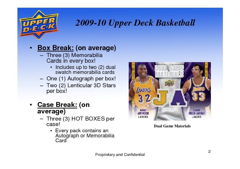 Please click the links below to purchase this product by the Box or Case CASE 2009/10 Upper Deck Basketball Hobby 12 Box Case : Blowout Cards - Sports Cards and Trading Cards Wholesale Online Store BOX 2009/10 Upper Deck Basketball Hobby Box : Blowout Cards - Sports Cards and Trading Cards Wholesale Online Store 2009/10 UPPER DECK BASKETBALL Configuration: 12 boxes per case. 16 packs per box. 20 cards per pack. The flagship brand delivers collecting excitement once again as 2009-10 Upper Deck Basketball introduces the largest autograph checklist ever in the product! Assemble the entire 200-card UD Signature Collection Set! CONTENT HIGHLIGHTS: - Collect The Largest Signature Set Ever Produced In Upper Deck! The 200 Card Ud Signature Collection Set! - Three (3) Memorabilia Cards In Every Box! - Includes Up To Two (2) Dual Swatch Memorabilia Cards Per Box! - One (1) Autograph In Every Box! - Look For Hot Boxes With Every Pack Containing An Autograph Or Memorabilia Card, Falling Three (3) Per Case, On Average! - 3D Lenticular Stars Fall 2 Per Box! - Uncover Unique Now Appearing Inserts And Masterpieces Inserts! BOX BREAK: (on average) - Three (3) Memorabilia Cards in every box! - Includes up to two (2) dual swatch memorabilia cards - One (1) Autograph per box! - Two (2) Lenticular 3D Stars per box! CASE BREAK: (on average) - Three (3) HOT BOXES per case! - Every pack contains an Autograph or Memorabilia Card PRODUCT BREAKDOWN Memorabila Cards: (3 per box, on average) - UD Dual Game Jersey - UD Dual Game Jersey Parallel (# to 150) - VS. Dual Materials - VS. Dual Materials Parallel (# to 150) - UD Game Materials - UD Game Materials Parallel (# to 150) Autographed Cards: (1 per box, on average) - UD Signature Collection - 200 card set! - Sophomore Sensations Auto Parallel (# to 199) Inserts and Parallels - 3D Stars - Masterpieces - Now Appearing Regular Cards and Rookies - 200 Regular Cards - 40 Star Rookies - 55 UD Immortals View Checklist* *Adobe Acrobat Reader required to view checklist. View Sell Sheet Info* *Microsoft PowerPoint required to view file. ![]() ![]() ![]()