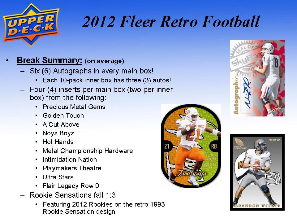 Below you will find the most up-to-date product information available. Our goal is to compile as much information within this THREAD regarding this product as possible. Throughout the Pre-sell process, we will update this thread with any content changes, videos/images, or any other manufacturer announcements that are made before the product is released. Once the product comes live, this thread will also be a great resource for break and content information. Please click the links below to purchase this product by the Box or Case CASE http://www.blowoutcards.com/index.ph...oducts_id=7512 BOX http://www.blowoutcards.com/index.ph...oducts_id=7513 2012 Upper Deck Fleer Retro Football ![]() ![]() ![]() ![]() ![]() Last edited by blowoutcards2; 02-23-2013 at 11:59 AM. |
