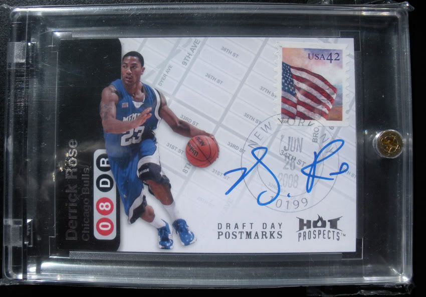 Hey guys, I've got this nice Derrick Rose Hot Prospects Draft Day Postmarks On-Card Auto Rookie #/50 up for grabs. Cool card, it was signed at the draft and it has a real USPS postmark and actual stamp on the card.