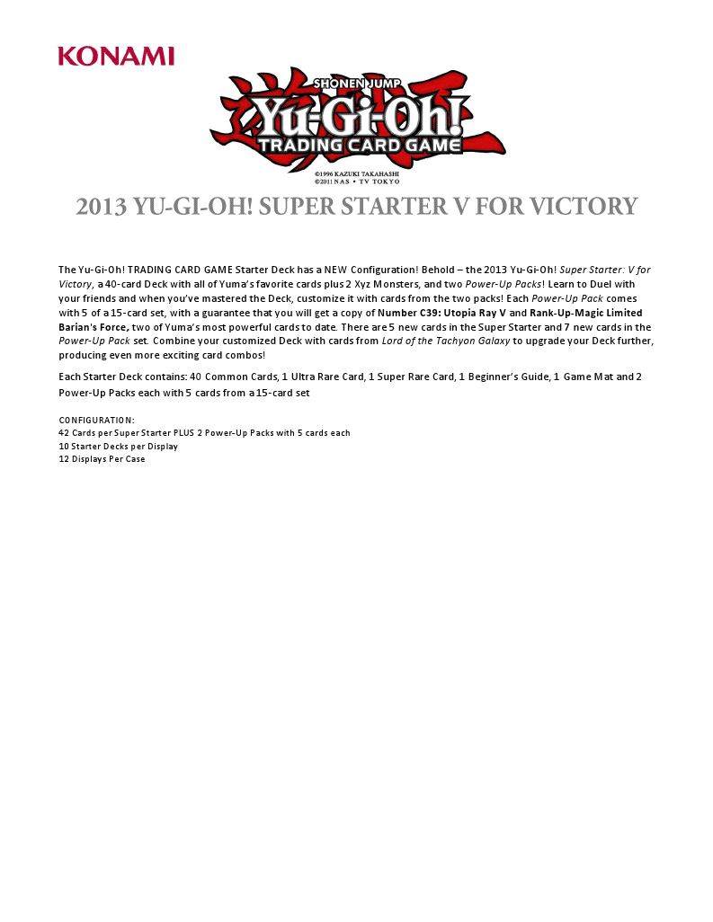 Below you will find the most up-to-date product information available. Our goal is to compile as much information within this THREAD regarding this product as possible. Throughout the Pre-sell process, we will update this thread with any content changes, videos/images, or any other manufacturer announcements that are made before the product is released. Once the product comes live, this thread will also be a great resource for break and content information. Blowout Cards offers two ways to Pre-Order New releases! If you would like to pre-order this product in full, you may do so by purchasing box and/or case pre-orders on our website. We also offer our customers the option of locking in on ANY pre-sell case price with only a $200 deposit per case! By doing so, you are reserving a case at the current pre-sell pricing. The balance of the case price will be due when the product is shipped. Please email Chris@blowoutcards.com for details. Attention Multi-Case and Group Breakers! If you are looking to purchase multi-case lots (2+,5+, 10+ Cases), Blowout Cards will do our best to earn your business! Simply email Chris@blowoutcards.com for our multi-case break pricing! (Excludes Panini Mapp Products). Thanks again for your continued business. Chris Please click the links below to purchase this product by the Box or Case CASE Coming Soon... BOX Coming Soon... 2013 Konami Yugioh Super Starter: V for Victory ![]() |