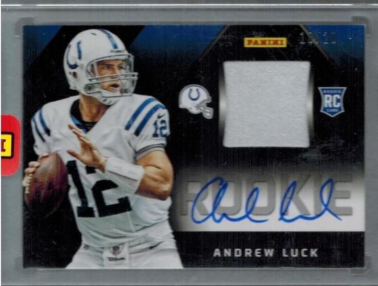 I'm looking to get an on-card auto and RPA (or jersey auto) for most of the 2012 Rookie class QB/RB's. Everyone knows who they are but I'll list below exactly what I need. My bucket is updated daily. I'm not even sure if all of these guys have on-card autos, but... ***NO STICKER AUTO'S PLEASE AND NOTHING OVER $100*** (exception: Luck/RGIII/Wilson up to $300) I'm on the fence about booklets, but I'm gonna avoid those for now. I'm a bit picky so please none of the ones that have "00" jersey numbers in the pictures or blank jerseys like in Bowman. Also, no Strata Clear Cuts or Gridiron Gems. College Unis are fine, like with most Upper Deck or Fleer Retro, but no Press Pass/Sage/Leaf. Here's what I have so far... * = incoming ANDREW LUCK BRANDON WEEDEN 2012 Panini Contenders - Playoff Ticket 81/99 2012 Panini Crown Royale - Rookie Silhouette Silver 095/149 2012 Panini Limited - Material Phenoms Autograph 132/199 2012 Upper Deck SP Authentic - Rookie Auto Patch 189/885 BROCK OSWEILER *2012 Panini Limited - Material Phenoms Autograph /199 2012 Topps Valor - Legionary Autograph Speed 37/70 KIRK COUSINS 2012 Upper Deck SP Authentic - Sign of the Times NICK FOLES 2012 Panini Absolute - Rookie Premiere Materials Signature 140/299 *2012 Panini Black - Rookie Signature Materials Prime /349 2012 Panini Prestige - Draft City Destinations Autograph 2012 Topps Chrome - Rookie Autograph ROBERT GRIFFIN III 2012 Topps Valor - Valor Autograph 01/75 RUSSELL WILSON RYAN TANNEHILL ALFRED MORRIS BERNARD PIERCE *2012 Panini Black - Rookie Signature Materials Prime /349 DAVID WILSON *2012 Panini Prime Signatures - Rookie Prime Material Signature 50/99 2012 Panini Prime Signatures - RPS Rookie Prime Signature 049/199 DOUG MARTIN 2012 Panini Absolute - Rookie Premiere Materials Signature 061/299 *2012 Panini Limited - Material Phenoms Autograph /199 2012 Topps Valor - Legionary Autograph Discipline 17/25 ISAIAH PEAD *2012 Panini Crown Royale - Rookie Silhouette Silver /249 *2012 Panini National Treasures - Rookie Signature Materials Gold /49 LAMAR MILLER 2012 Panini Absolute - Rookie Premiere Materials Signature 137/299 2012 Panini Contenders - Rookie Ticket RPS Autograph 2012 Panini Crown Royale - Rookie Silhouette Gold 66/99 *2012 Topps Chrome - Rookie Autograph LAMICHAEL JAMES *2012 Topps Chrome - Rookie Autograph Refractor 030/178 *2012 Topps Valor - Legionary Autograph 027/146 ROBERT TURBIN *2012 Topps Platinum - Rookie Autograph Blue Refractor 95/99 TRENT RICHARDSON 2012 Panini Elite - Rookie Inscriptions Autograph 2012 Upper Deck SP Authentic - Rookie Auto Patch 118/425 VICK BALLARD 2012 Topps Valor - Shield of Honor Autograph Patch 22/26