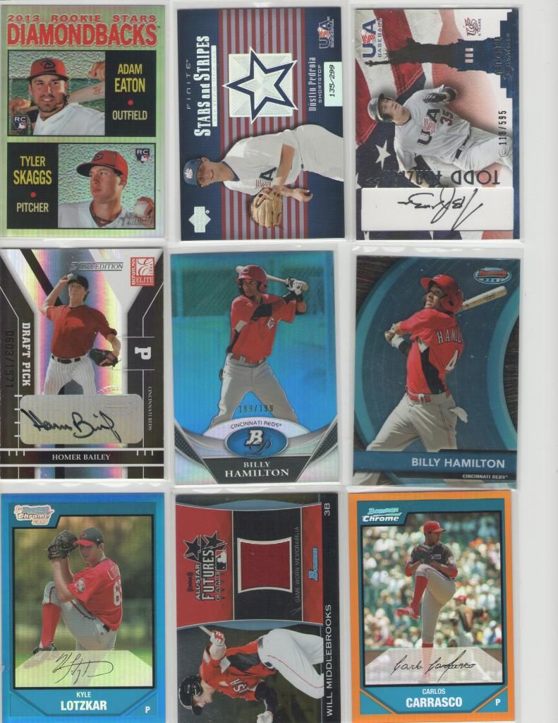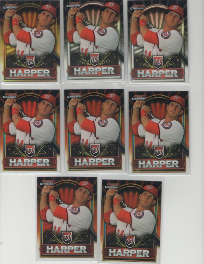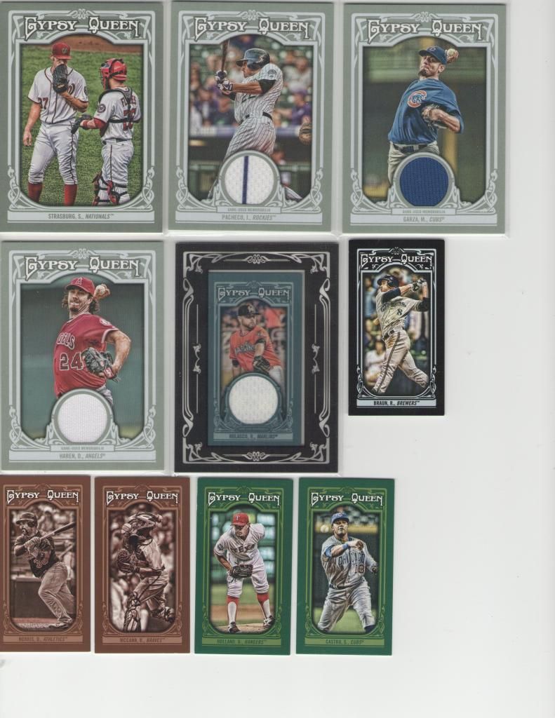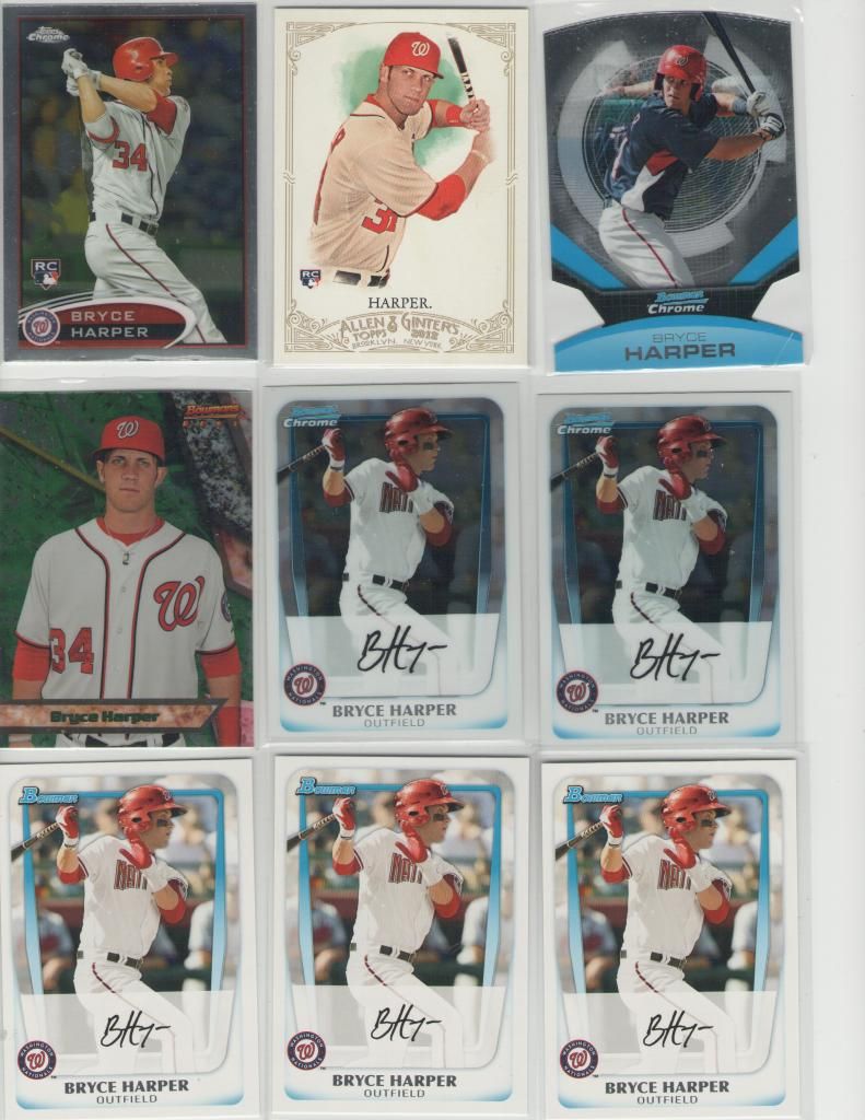 Bryce Harper 2010 Bowman Chrome USA refractor #221/777 Price: $145 ![]() Harper Lot (Includes the 26 cards below): ![]() ![]() ![]() 2012 Bowman Chrome Prospect BCP10 x2 2012 Bowman Purple BP10 2012 Bowman Chrome 10 x2 2012 Bowman Prospect BP10 2012 Bowman Platinum 56 x2 2012 Bowman Platinum Cutting Edge CES-BH 2012 Topps Chrome 196 2012 Topps Allen & Ginter 12 2011 Bowman Chrome Futures Die Cut 1 2011 Bowman's Best BBP51 2011 Bowman Chrome Prospect BCP1 x2 2011 Bowman Prospect BP1 x3 2011 Topps Retail Gold Refractor BCE1 2011 Topps Retail Silver Refractor BCE1 x2 2011 Topps Retail Red Refractor BCE1 x5 Lot Price (26 cards): $90 Wacha Lot: ![]() Three (3) non-auto 2012 Bowman Chrome Draft refractors 2012 Donruss Elite Aspirations Die-cut auto #/100 Lot Price: $37 Adam Eaton/Tyler Skaggs 2013 Topps Heritage Chrome refractor #/564: $6 Dustin Pedroia 2003 Finite Stars and Stripes #/299: $5 Todd Frazier 2007 USA Baseball auto #/595: $8 Homer Bailey 2004 Donruss Elite auto #/1571: $4 Billy Hamilton 2011 Bowman Platinum Blue refractor #/199: SOLD Billy Hamilton 2012 Bowman's Best: SOLD Kyle Lotzkar 2007 Bowman Chrome Draft Blue refractor #/199: $5 Will Middlebrooks 2011 Bowman Draft Futures Jersey Gold #/50: $10 Carlos Carrasco 2007 Bowman Chrome Draft Orange Refractor #04/25: $5 ![]() A.J. Pollock 2009 Bowman Chrome Draft xfractor auto #146/225: $19 A.J. Pollock 2009 Bowman Chrome Draft auto: $13 ![]() Stephen Strasburg 2013 Gypsy Queen SSP: $40 Jordan Pacheco 2013 Gypsy Queen Jersey: $2 Matt Garza 2013 Gypsy Queen Jsrsey: $2 Dan Haren 2013 Gypsy Queen Jersey: $2 Ricky Nolasco 2013 Gypsy Queen Framed Jersey: $2 Ryan Braun 2013 Gypsy Queen Black mini #/199: SOLD Derek Norris 2013 Gypsy Queen Sepia mini #/50: SOLD Brian McCann 2013 Gypsy Queen Sepia mini #/50: SOLD Derek Holland 2013 Gypsy Queen Green mini #/99: SOLD Starlin Castro 2013 Gypsy Queen Green mini #/99: SOLD