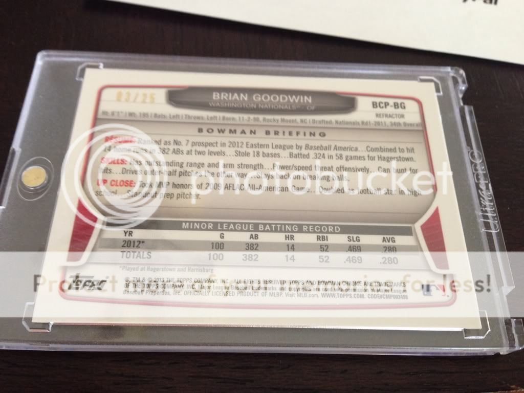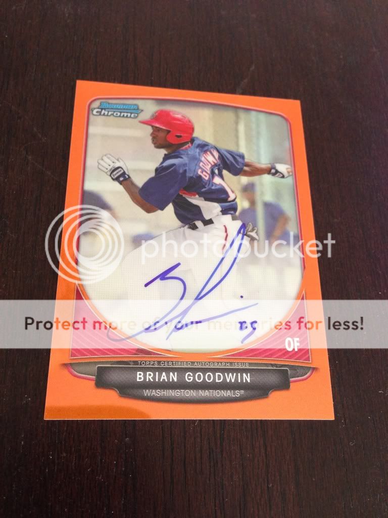 A Brian Goodwin orange refractor auto 3/25 from 2013 bowman. Last one sold on eBay for $245 shipped. First $200 gets this one shipped with insurance and delivery confirmation. Here's the pics: ![]() ![]() Post In the thread if you want it and I will pm you the payment details. Thanks!