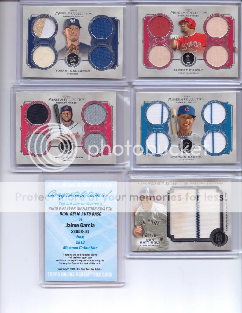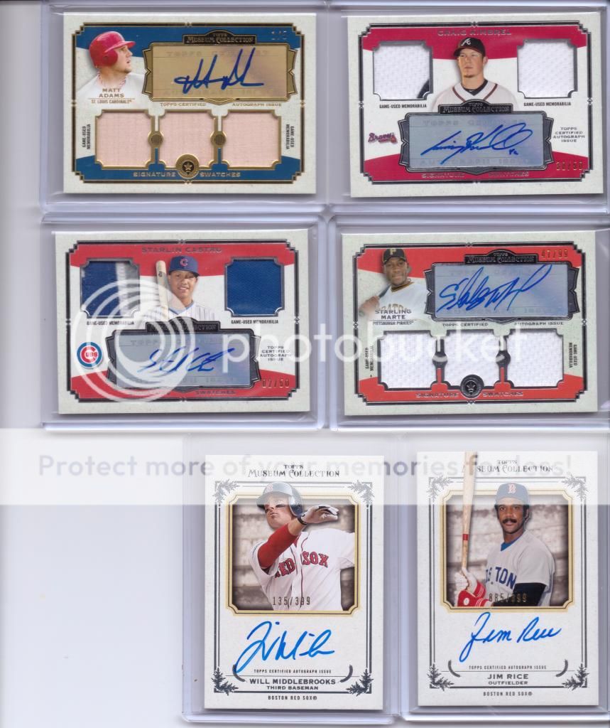 -First Post in the Thread gets item, no PMs please -Will take offers, will not be offended by any offer! -Thanks for looking!! Matt Adams Triple Bat relic auto 1/5 $40 Craig Kimbrel Dual Patch/Jersey auto 30/50 $35 Starlin Castro Dual Patch/Jersey auto 02/50 $30 Starling Marte Triple Jersey auto 47/99 $15 Will Middlebrooks auto 135/399 $10 Jim Rice auto 085/399 SOLD ![]() Anthony Rizzo auto 358/399 $15 Wally Joyner 252/399 SOLD ![]() Nate Eovaldi auto 350/399 SOLD Billy Butler auto 057/399 SOLD Quad relic Cal Ripken Jr/Alex Rodriguez/Derek Jeter/Troy Tulowitzki 37/75 $30 ![]() Yovani Gallardo quad relic patch/triple jersey 65/99 $5 Albert Pujols quad relic jersey/triple bat 07/99 $12 Carlos Santana quad relic patch/triple jersey 18/99 $5 Starlin Castro quad jersey relic 81/99 $12 Jamie Garcia dual relic auto redemption $15 Don Mattingly Momentous Materials Jumbo Jersey 38/50 SOLD