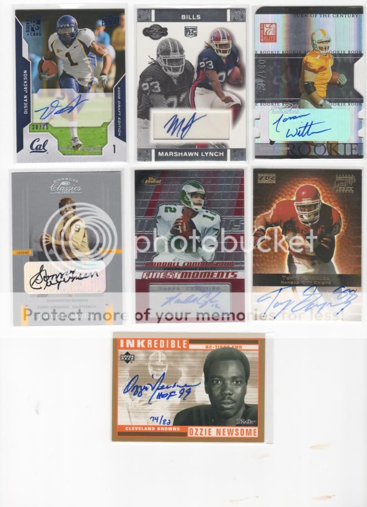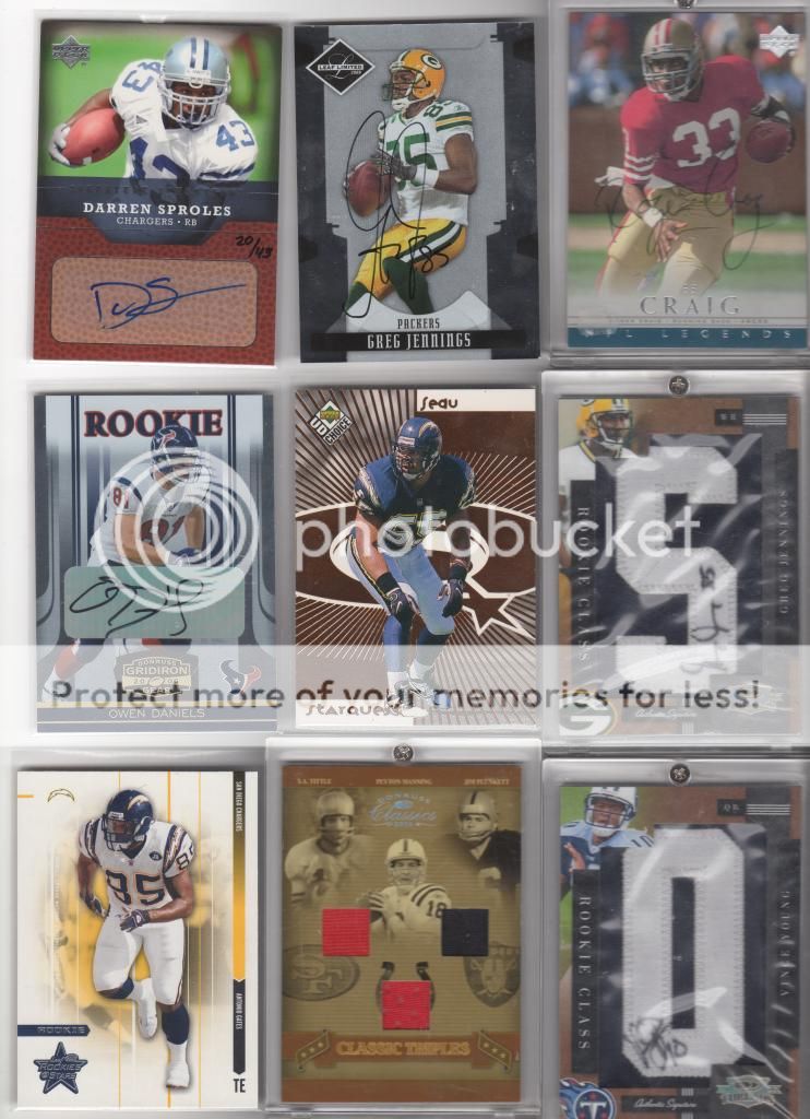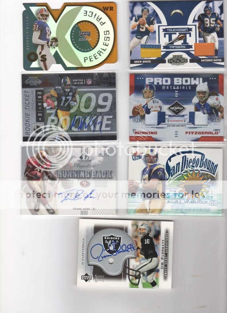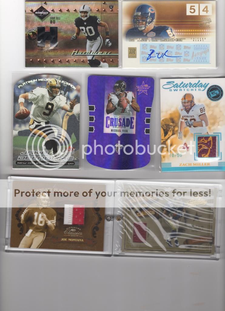EVERYTHING IS PRICED REALLY WELL AND IS FIRM. If you purchase $100+ I will take another 5% off. If you message me saying you want the card you get it. If you send me PM's asking if I will take less then my selling price then you don't have the cards reserved so please don't get upset if someone pays full price and gets the card. I've priced stuff low as I have thousands of cards to move and am trying to avoid ebay as much as possible. Pic 1 Barry Sanders 2009 Donruss Classics auto 21/25 $80 SOLD Brett Favre 2007 Topps auto $70 SOLD Jamaal CHarles 2008 SPX auto jersey x3 SPX 20/99 $15 SOLD Bo Jackson 2009 Donruss Classics patch 50/50 $20 Tiki & Ronde Barber 2004 Lineage auto 16/100 $20 SOLD Anquan Boldin 2003 Contenders auto 370/524 $35 SOLD Hank Stram mystery cuts auto 3/5 $30 SOLD Jason Witten bowmans best rc auto $30 SOLD [IMG] ![]() Pic 2 Ozzie Newsome inkredible auto HOF99 rare 74/82 $15 SOLD Sunny Jurgensen donruss classics 15/25 auto $20 Randall Cunningham finest moments auto $15 SOLD Tony Gonzalez 2000 Bowman Reserve auto $15 SOLD Desean Jackson 2000 UD RC Auto 38/75 $20 Marshawn Lynch 2007 Co-Signers auto $20 Jason Witten 2003 Elite auto die-cut 31/125 $75 [IMG] ![]() Pic 2a Junior Seau/spikes 1998 starquest gold 59/100 $25 Greg jennings auto SOLD Owen Daniels 2006 gridiron gear auto rc 18/81 $15 Darren Sproles 2005 UD Signatures Sensations SP rc auto 20/43 $25 Greg Jennings 2006 Threads letter rc auto 232/240 Roger Craig 2000 UD SP auto $20 Vince Young 2006 threads letter auto 17/100 $15 Manning/Tittle/Plunket triple jersey 2006 classics 14/100 $15 SOLD [IMG] ![]() Pic 2b Zach Miller 2007 press pass patch 10/50 $10 SOLD Jake Delhome 2000 ultra platinum medallion 15/50 $10 Vick 2005 purple crusade 48/50 $10 Jerry Rice 2004 Limited GU Helmet rare 13/25 SP $20 Urlacher 2002 Topps Reserve auto $25 SOLD Joe Montana 2006 classics patch 22/25 $25 SOLD Emmitt Smith 2003 Leather Laces 219/250 $10 [IMG] ![]() Pic 3 All items in this picture are $10 each Gates is 7/25 on the back r williams is 2/100 on the back SOLD M lynch hit /100 SOLD [IMG] ![]() Pic 4 All items in this picture are $10 each D Jackson is 38/75 tiki is 19/50 on back holt is 18/25 on back parker is 47/100 on back j nelson SOLD l johnson is 71/100 Mcnabb SOLD [IMG] ![]() Pic 5 All items in this picture are $10 each p price 15/20 on back f gore 16/50 brees/gates 24/25 on back manning/fitz 3/25 on back m wallace contenders auto SOLD [IMG] ![]() Pic 6 All items in this picture are $6 each [IMG] ![]() Pic 7 All items in this picture are $6 each Dent sold Sproles SOLD [IMG] ![]() Pic 8 All items in this picture are $6 each R White sold Brad Van Pelt SOLD [IMG] ![]() Last edited by MarinersFan06; 09-30-2013 at 08:18 PM. |