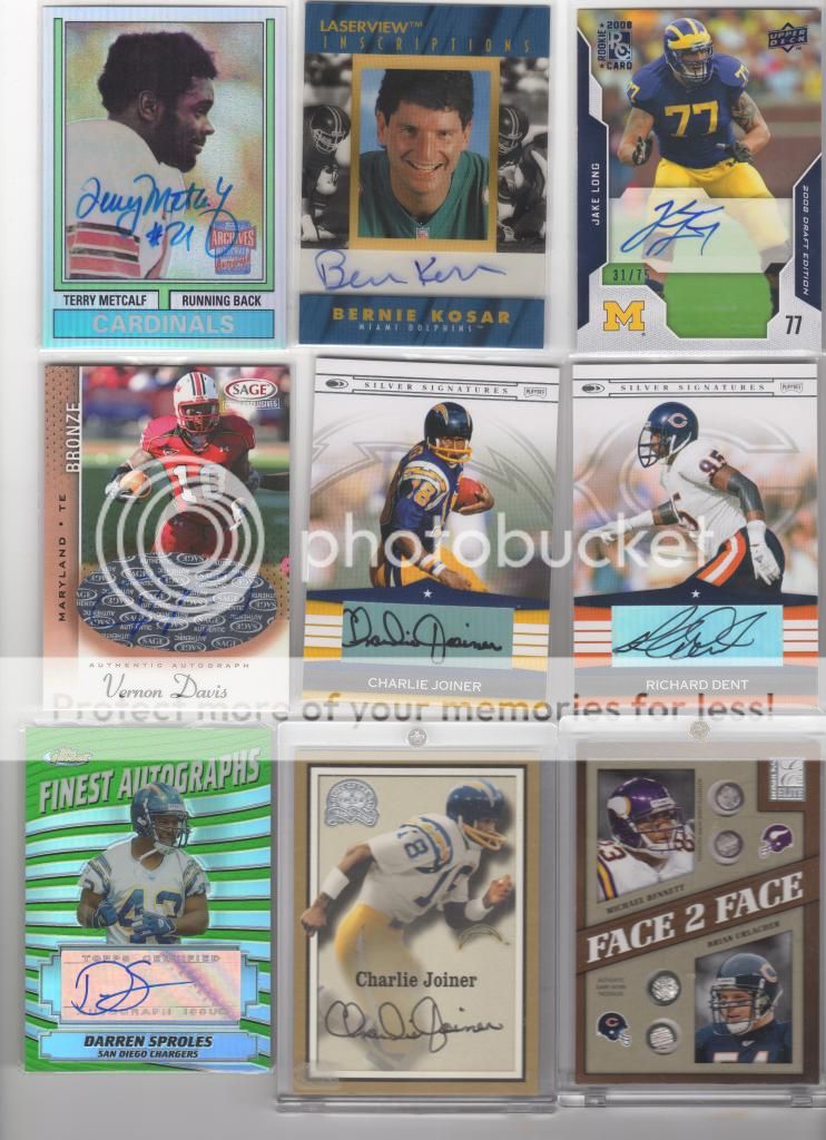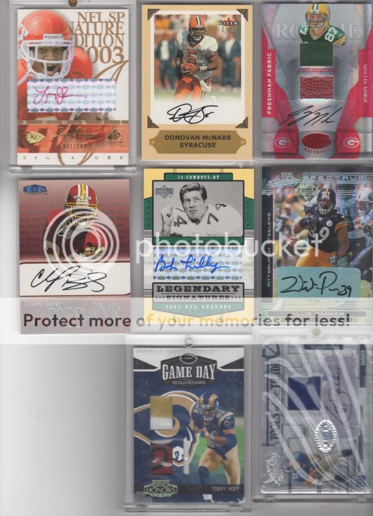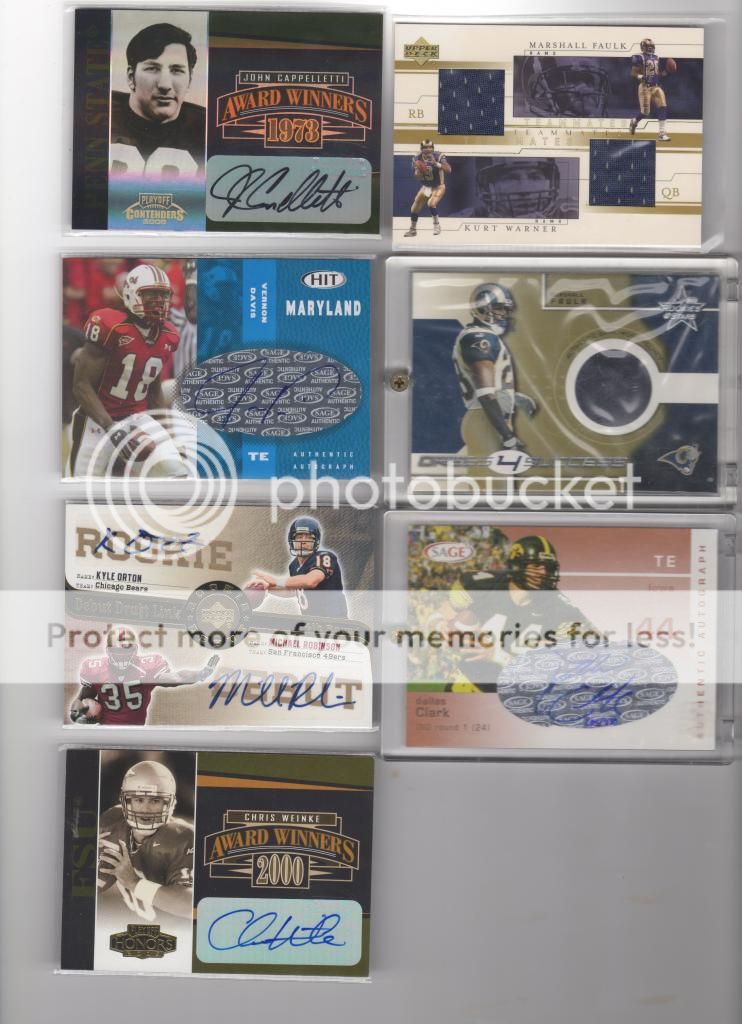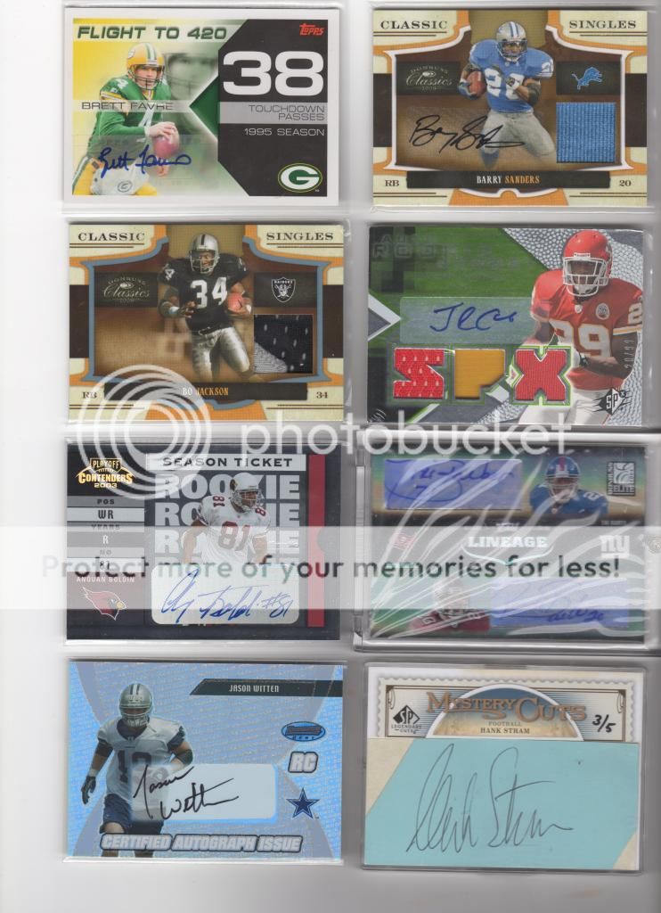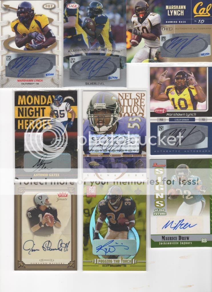 EVERYTHING IS PRICED REALLY WELL AND IS FIRM. If you purchase $100+ I will take another 5% off. If you message me saying you want the card you get it. If you send me PM's asking if I will take less then my selling price then you don't have the cards reserved so please don't get upset if someone pays full price and gets the card. I've priced stuff low as I have thousands of cards to move and am trying to avoid ebay as much as possible. Pic 1 Barry Sanders 2009 Donruss Classics auto 21/25 $80 SOLD Brett Favre 2007 Topps auto $70 SOLD Jamaal CHarles 2008 SPX auto jersey x3 SPX 20/99 $15 SOLD Bo Jackson 2009 Donruss Classics patch 50/50 $20 Tiki & Ronde Barber 2004 Lineage auto 16/100 $20 SOLD Anquan Boldin 2003 Contenders auto 370/524 $35 SOLD Hank Stram mystery cuts auto 3/5 $30 SOLD Jason Witten bowmans best rc auto $30 SOLD [IMG] ![]() Pic 2 Ozzie Newsome inkredible auto HOF99 rare 74/82 $15 SOLD Sunny Jurgensen donruss classics 15/25 auto $20 Randall Cunningham finest moments auto $15 SOLD Tony Gonzalez 2000 Bowman Reserve auto $15 SOLD Desean Jackson 2000 UD RC Auto 38/75 $20 Marshawn Lynch 2007 Co-Signers auto $20 Jason Witten 2003 Elite auto die-cut 31/125 $75 [IMG] ![]() Pic 2a Junior Seau/spikes 1998 starquest gold 59/100 $25 Greg jennings auto SOLD Owen Daniels 2006 gridiron gear auto rc 18/81 $15 Darren Sproles 2005 UD Signatures Sensations SP rc auto 20/43 $25 Greg Jennings 2006 Threads letter rc auto 232/240 Roger Craig 2000 UD SP auto $20 Vince Young 2006 threads letter auto 17/100 $15 Manning/Tittle/Plunket triple jersey 2006 classics 14/100 $15 SOLD [IMG] ![]() Pic 2b Zach Miller 2007 press pass patch 10/50 $10 SOLD Jake Delhome 2000 ultra platinum medallion 15/50 $10 Vick 2005 purple crusade 48/50 $10 Jerry Rice 2004 Limited GU Helmet rare 13/25 SP $20 Urlacher 2002 Topps Reserve auto $25 SOLD Joe Montana 2006 classics patch 22/25 $25 SOLD Emmitt Smith 2003 Leather Laces 219/250 $10 [IMG] ![]() Pic 3 All items in this picture are $10 each Gates is 7/25 on the back r williams is 2/100 on the back SOLD M lynch hit /100 SOLD [IMG] ![]() Pic 4 All items in this picture are $10 each D Jackson is 38/75 tiki is 19/50 on back holt is 18/25 on back parker is 47/100 on back j nelson SOLD l johnson is 71/100 Mcnabb SOLD [IMG] ![]() Pic 5 All items in this picture are $10 each p price 15/20 on back f gore 16/50 brees/gates 24/25 on back manning/fitz 3/25 on back m wallace contenders auto SOLD [IMG] ![]() Pic 6 All items in this picture are $6 each [IMG] ![]() Pic 7 All items in this picture are $6 each Dent sold Sproles SOLD [IMG] ![]() Pic 8 All items in this picture are $6 each R White sold Brad Van Pelt SOLD [IMG] ![]() Last edited by MarinersFan06; 09-30-2013 at 08:18 PM. |