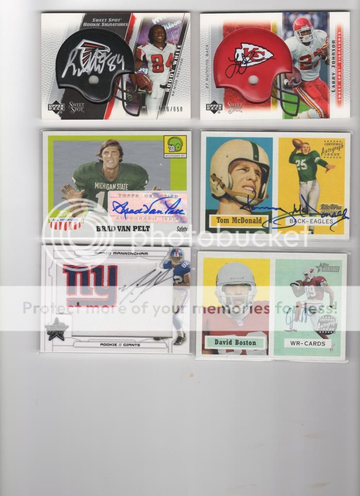 Urlacher 2002 Topps Reserve auto $25 Roddy white sweet spot auto $6 Richard dent silver sig auto $6 $47 dlvd. If you'd make it an even $45 dlvd ill take those, at work right now but pm me paypal and ill have you paid in a few hours.