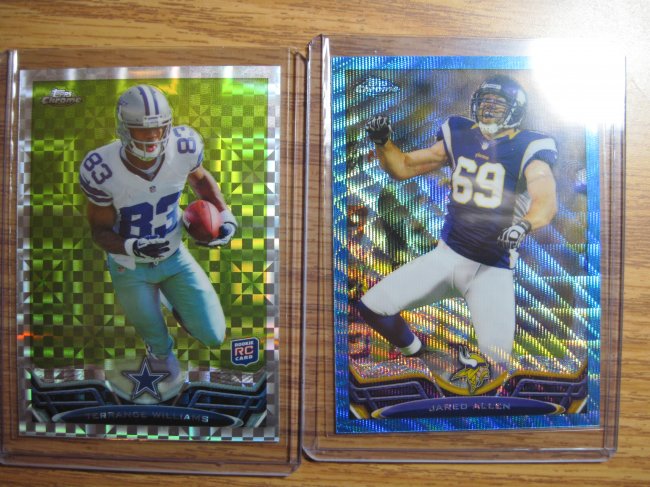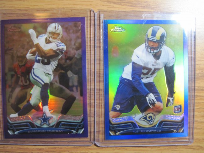 nothing much notable out of the first one except for this And the Terrance Williams X-Fractor (Jared Allen Blue Wave came from the second blaster) I went back today for another one. The second blaster had these two in the first two packs. Mcdonald is jersey numbered 25/199 (I guess someone might care about that) and Murray is close to that magic number (249/499) After those two cards, I thought I was done. Boy was I wrong. This was in the next pack 11/15 Last edited by drew306; 12-11-2013 at 05:03 PM. |