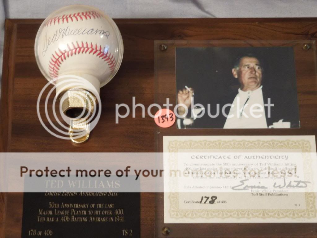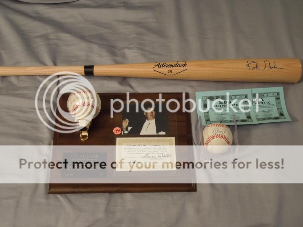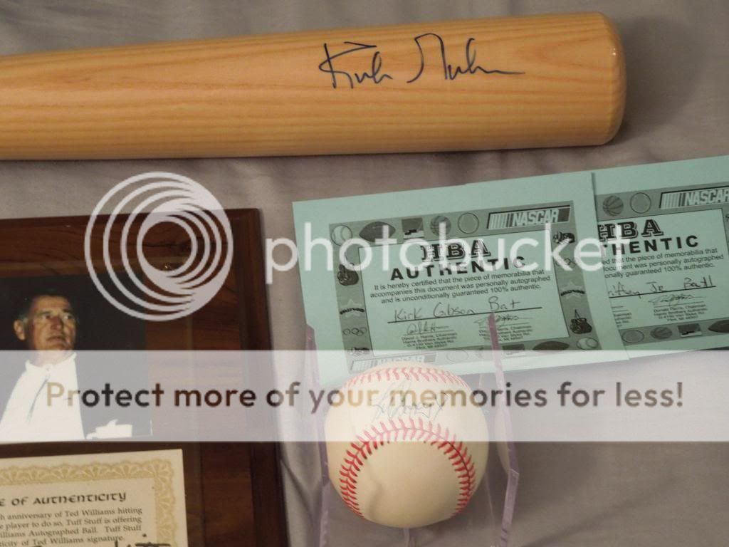 Detroit Tigers All-Time Team (8 autograph) lithograph (#1181/1999) ![]() 8 auto's: George Kell Al Kaline Bill Freehan Mickey Lolich John Hiller Jack Morris Alan Trammell Kirk Gibson Ted Williams - autographed OAL ball and plaque (#178/406) ![]() ![]() Kirk Gibson - autographed Adirondack bat Ken Griffey Jr. - autographed OAL ball ![]()
