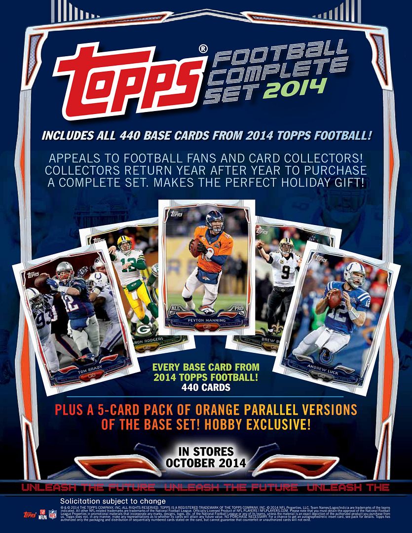 Below you will find the most up-to-date product information available. Our goal is to compile as much information within this THREAD regarding this product as possible. Throughout the Pre-sell process, we will update this thread with any content changes, videos/images, or any other manufacturer announcements that are made before the product is released. Once the product comes live, this thread will also be a great resource for break and content information. Blowout Cards offers two ways to Pre-Order New releases! If you would like to pre-order this product in full, you may do so by purchasing box and/or case pre-orders on our website. We also offer our customers the option of locking in on ANY pre-sell case price with only a $200 deposit per case! By doing so, you are reserving a case at the current pre-sell pricing. The balance of the case price will be due when the product is shipped. Please email Chris@blowoutcards.com for details. Attention Multi-Case and Group Breakers! If you are looking to purchase multi-case lots (2+,5+, 10+ Cases), Blowout Cards will do our best to earn your business! Simply email Chris@blowoutcards.com for our multi-case break pricing! (Excludes Panini Mapp Products). Thanks again for your continued business. Chris Please click the links below to purchase this product by the Box or Case CASE 2014 Topps Football Factory Set - 12 Set Case BOX 2014 Topps Football Factory Set 2014 Topps Football Complete Factory Set