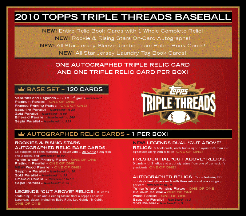 Topps unveiled the basic product breakdown and preview images for its 2010 Triple Threads baseball card set on Thursday, a product that appears to take the staples of the always popular line and add even more high-end variety to the fold.