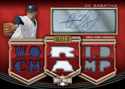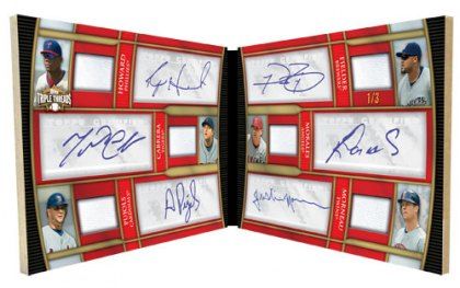 Please click the links below to purchase this product by the Box or Case CASE http://www.blowoutcards.com/index.ph...oducts_id=4340 BOX http://www.blowoutcards.com/index.ph...oducts_id=4342 2010 Topps Triple Threads Baseball Configuration: 18 display boxes per master case*. 2 mini boxes per display box. 1 pack per mini box. 6 cards per pack. *Two 9-box inner cases per master case. **UPDATE: Stephen Strasburg has been added, click for more info! ** PRODUCT HIGHLIGHTS- Winner of Beckett "Product of the Year" Award - Unique & Innovative Autographed & Relic Card Combinations - At LEAST Three Relics on EVERY Card! - Hobby Exclusive! Every 18-Box Case Contains: - A 1 of 1 Autographed Triple Relic Card - A Triple Autographed Triple Relic Card, Numbered* to 36 or less Every Box Contains: - An Autographed Triple Relic Card, numbered* to 99 or less - A Triple Relic Card, numbered* to 36 or less Every Pack Contains: - 1 Triple Relic Card, numbered* to 99 or less - 2 Base Parallel Cards, numbered* to 525 or less - 3 Base Cards, Numbered* NEW! Entire Relic Book Cards with 1 Whole Complete Relic! NEW! Rookie & Rising Stars On-Card Autographs! NEW! All-Star Jersey Sleeve Jumbo Team Patch Book Cards! NEW! All-Star Jersey Laundry Tag Book Cards! CARD SETS BASE SET - 120 CARDS Veterans and Legends - 120 MLB® greats numbered* Platinum Parallel - ONE OF ONE! Framed Printing Plates - ONE OF ONE! Sapphire Parallel - Numbered* to 25 Gold Parallel - Numbered* to 99 Emerald Parallel - Numbered* to 240 Sepia Parallel - Numbered* to 525 AUTOGRAPHED RELIC CARDS - 1 PER BOX! Rookies & Rising Stars Autographed Relic Base Cards: 48 subjects on cards featuring 1 player with 1 ON-CARD autograph and 3 relics, and numbered* to 99. "White Whale" Printing Plates - ONE OF ONE! Platinum Parallel - ONE OF ONE! NEW! Wood Parallel - ONE OF ONE! Sapphire Parallel - Numbered* to 10 Gold Parallel - Numbered* to 25 Emerald Parallel - Numbered* to 50 Sepia Parallel - Numbered* to 75 Legends "Cut Above" Relics: 10 cards containing 3 relics and a cut signature from a Topps Exclusive Legendary player, including: Babe Ruth, Lou Gehrig, Ty Cobb. ONE OF ONE! New! Legends Dual "Cut Above" Relics: 6 book cards, each featuring 2 players with their cut signatures along with 6 relics. ONE OF ONE! Presidential "Cut Above" Relics: 6 cards with 3 relics and a cut signature from one of our nation's presidents. ONE OF ONE! Autographed Relics: Cards featuring 80 of today's best players each with three relics and one autograph per card. Numbered* to 18. "White Whale" Printing Plates - ONE OF ONE! Platinum Parallel - ONE OF ONE! Wood Parallel - ONE OF ONE! Sapphire Parallel - Numbered* to 3 Gold Parallel - Numbered* to 9 Rookies & Rising Stars Autographed Relic Pairs: 6 book cards featuring 2 players, 2 signatures and 6 relics on each numbered* to 50 card. Platinum Parallel - ONE OF ONE! Sapphire Parallel - Numbered* to 10 Gold Parallel - Numbered* to 25 Jumbo Plus Autograph Relics: 16 book cards with 1 player and his autograph along with 2 relics on one side and 1 jumbo relic on the other. Numbered* to 3 Platinum Parallel - ONE OF ONE! Autographed Relic Pairs: 6 book cards featuring 2 players, 2 signatures and 6 relics on each. Numbered* to 18. Platinum Parallel - ONE OF ONE! Sapphire Parallel - Numbered* to 3 Gold Parallel - Numbered* to 9 Autographed Relic Combos: 15 different cards with 3 players, 3 relics and 3 autographs on each card! Numbered* to 36. "White Whale" Printing Plates - ONE OF ONE! Platinum Parallel - ONE OF ONE! Wood Parallel - ONE OF ONE! Sapphire Parallel - Numbered* to 3 Gold Parallel - Numbered* to 9 Emerald Parallel - Numbered* to 18 Sepia Parallel - Numbered* to 27 Letter Plus Relics: 16 book cards featuring 1 player, 1 autograph, 2 relics, and 1 letter patch. numbered* to 3. Platinum Parallel - ONE OF ONE! Autographed Relic DOUBLE COMBOS: 6 Book cards each featuring 6 players, 6 relics and 6 autographs on each card! Numbered* to 3. Platinum Parallel - ONE OF ONE! RELIC CARDS - 1 PER BOX! New! Singular Swatches: The most exciting relic delivery method in decades! Each ONE OF ONE book card showcases: 1 player with a complete relic piece such as sunglasses, wristband, necklace, etc. New! All-Star Jumbo Sleeve Patches: These ONE OF ONE book cards highlight a 2009 All-Star player and his All-Star sleeve patch PLUS 2 other All-Star patches! Sixty-six cards in all! New! All-Star Laundry Tags: Sixty-six ONE OF ONE book cards featuring a 2009 All-Star and his All-Star jersey laundry tag PLUS 2 other All-Star swatches! All-Star Logo Man: 66 cards, each with 1 player and 2 relics and the MLB logo man patch from their MLB All-Star Game jersey. ONE OF ONE! All-Star Patches: 66 cards featuring 1 player and 3 2009 MLB All-Star Game jersey patches. Numbered* to 9. Platinum Parallel - ONE OF ONE! Bat Name Plates: 15 ONE OF ONE book cards composed of 1 player and 3 relics, one of which is a one-of-a-kind bat name plate. Subjects include Pujols, Ruth and Ichiro. New! Bat Knobs: These 10 innovative ONE OF ONE cards feature a single player, including Cal Ripken, Jr. and Lou Gehrig, along with an actual game-used bat knob and 2 patches! XXIV: 18 book cards which open to reveal 24 or more relic pieces! Numbered* to 18. Platinum Parallel - ONE OF ONE! Sapphire Parallel - Numbered* to 3 Gold Parallel - Numbered* to 9 XXIV Legends: Five Topps Exclusive Legends including Roger Maris are featured in ONE OF ONE book cards featuring at least 24 relic pieces. Jumbo Plus Relics: 16 book cards with 1 player and 2 relics on one side and 1 jumbo relic on the other. Numbered* to 3. Platinum Parallel - ONE OF ONE! Letter Plus Relics: 16 book cards featuring 1 player and 2 relics on one side and 1 jumbo relic on the other. Numbered* to 3. Platinum Parallel - ONE OF ONE! Jumbo Patch Combos: 10 ONE OF ONE book cards featuring 3 players and 1 jumbo patch from each - 3 jumbo patches in all! Jumbo Letter/Number/Logo: ONE OF ONE book cards featuring 3 relics from a si