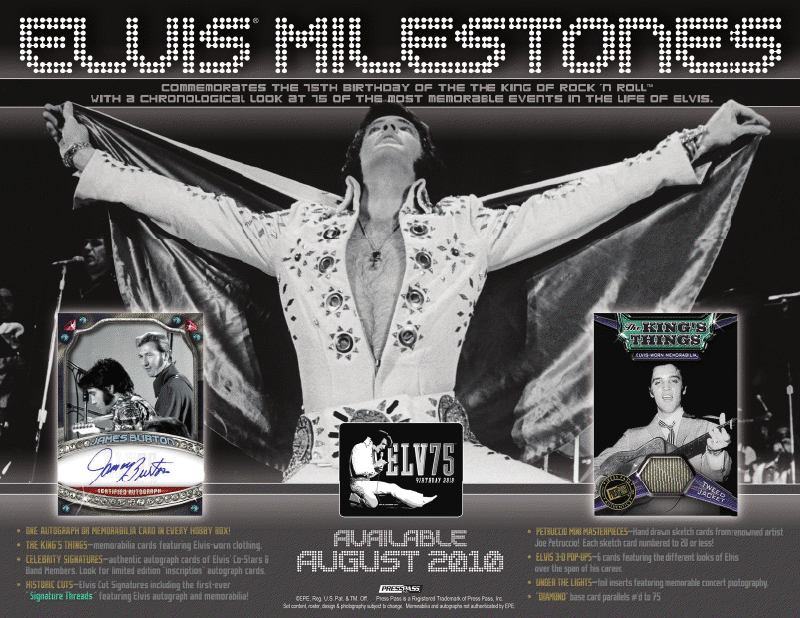 Please click the links below to purchase this product by the Box or Case CASE Coming Soon... BOX Coming Soon... 2010 Press Pass Elvis Milestones ![]() ![]() Configuration: 5 Cards per Pack 24 Packs per Box 20 Boxes per Case Product Info: ONE AUTOGRAPH OR MEMORABILIA CARD IN EVERY HOBBY BOX! 75-card base set. Petruccio Mini Masterpieces - Hand-drawn sketch cards from renowned artist Joe Petruccio...#'d to 20 or less! Elvis Band Members and Co-Stars Authentic Autographs and The King's Things memorabilia cards. Elvis Cut Signature cards including the first-ever SIGNATURE THREADS - a card featuring Elvis autograph and memorabilia! ![]() Last edited by blowoutcards2; 06-02-2010 at 03:03 PM. |