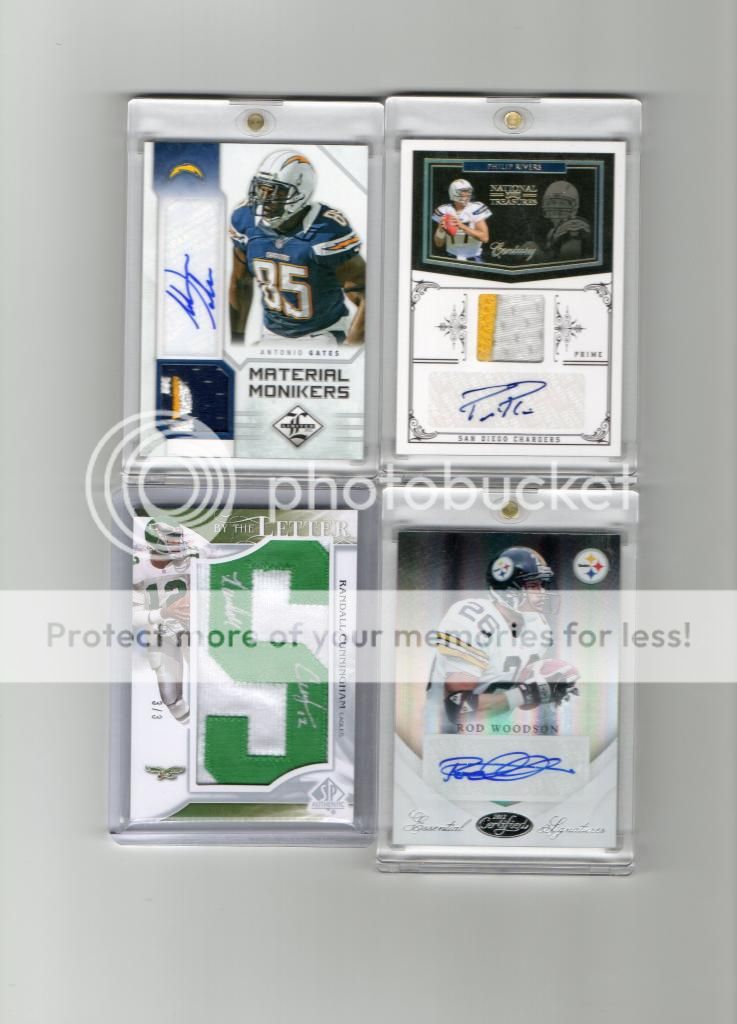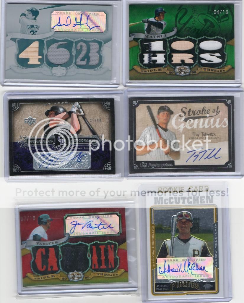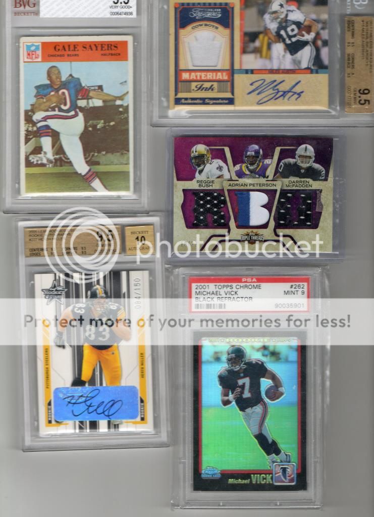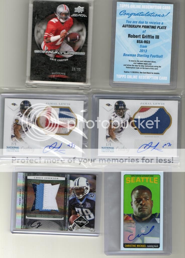 ![]() Sayers (Has a small "star" in bvg case) 80 Austin (9 auto) 55 Miller 150 Triple 75 Vick 105 ![]() Chargers 100 Cunningham 100 Woodson 125 ![]() Carter 20 RG3 300 Lewis 90 for both CJ2k 50 Michaels 65 ![]() Gonzalez 100 Matsui 30 Tulo 100 for both Varitek 100 McCutchen 100 ![]() Verlander 100 Aaron 260 Retro (sorry it cut off Justin Upton refractor /25) 105 Desert Sheild 50 for pair ![]() CP3 85 MJ 105 Curry 65 Dr. J 205 ![]() Buster Keaton booklet (spells hollywood 1/1) Hard to Scan 255 Justin Beiber 100 Also have memorabilia 1963 Reds Team Signed Baseball (rough shape but does have a legible Rose and Hutchinson) 1939 Dodgers Team Signed Baseball (better shape 15 or so sigs Durocher on SS) 49ers F/S Authentic Helmet Rice/Montana/Clark/Craig ect F/S Authentic Ray Lewis Helmet (have bane mask and oakley visor I could throw in) Bettis mini/Swann Mini Julius Erving I/O Basketball If interested in memorabilia please pm and we can discuss further.