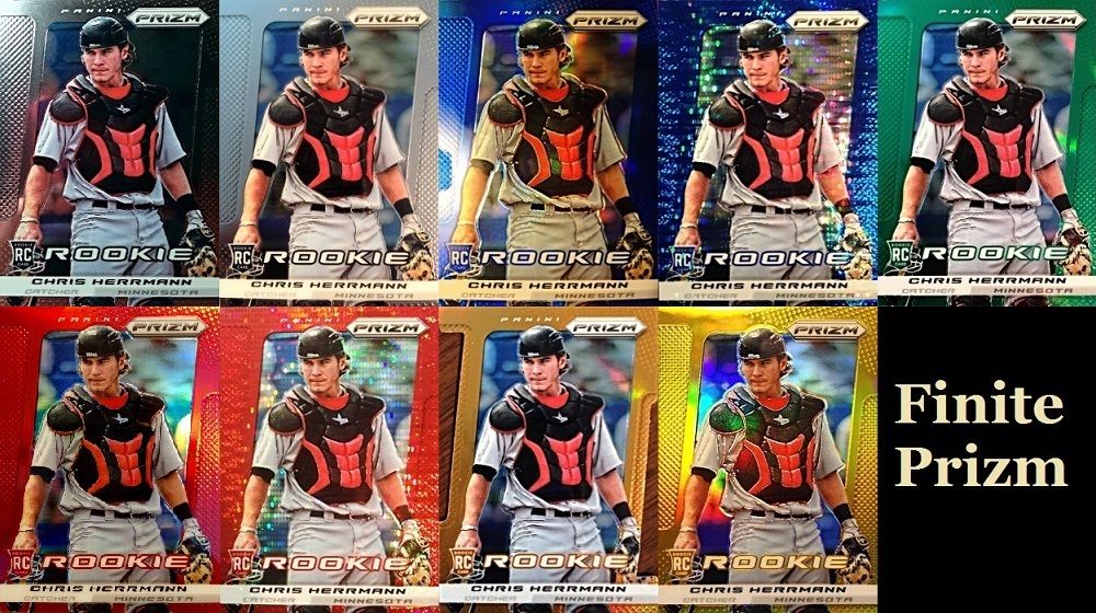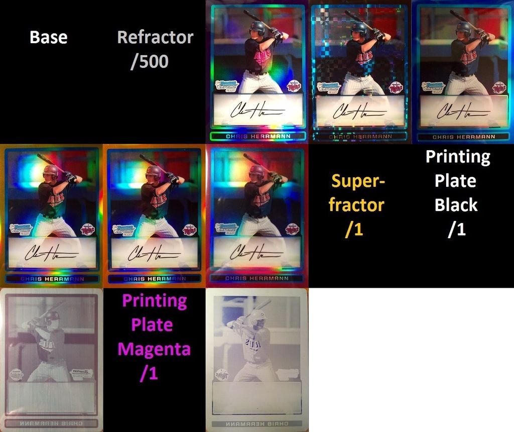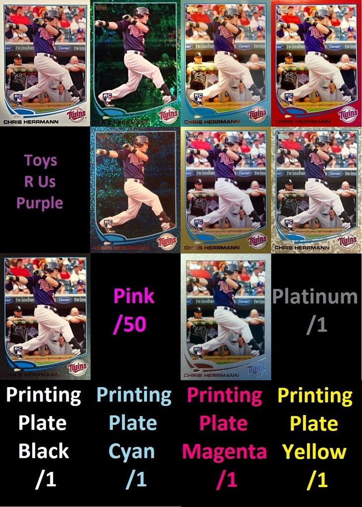First are a couple cards I grouped together in the same image because I didn't want to take the time to do each one individually: Joe Nathan Atomic Refractor /225 Mauer/Carew insert Molina blue refractor /99 Berrios, Gibson, Polanco refractors ![]() Next up is 2 more patterns of Joe Mauer from 2014 Tek. I'm pretty unsure on the pattern names, but I'll do my best... Spiral? ![]() and Laser Ice? ![]() That brings my Mauer Tek collection up to 5: Spiral, Laser Ice, Wave Gold Diffractor /99, Wave Disco Diffractor /50, and Press Proof Black /1: (Sorry if this pic is huge) ![]() Not sure if I'm going to seriously attempt the Mauer Tek rainbow or not, as it would be expensive and really difficult, but I will definitely pick up more patterns whenever I can! Love the looks of these. Side note, I'm taking my pictures of my Tek cards with a black background (cardboard paper underneath the card). I think they turn out really sharp that way- Definitely would recommend it! Next, some ink- Got this one for just a buck! Autograph of an All-Star closer, great looking card with a super solid sig? Yes please. 2008 Goudey Graphs, Glen Perkins: ![]() The rest of the cards I have to share today will be from my Chris Herrmann collection! These will be in no particular order, just showing off my new adds. I'm now over 70% completion, not including 1/1s! First off is 2 black parallels from 2013 Topps: 19/62: ![]() and 55/62: My 2013 Topps rainbow of Herrmann is getting there! Just the purple, pink /50, and then the 1/1s: ![]() Speaking of rainbows, after tracking down a Purple Refractor, my Herrmann rainbow from 2009 Bowman Chrome Draft is coming along nicely: ![]() I'm still missing the base and a refractor, both of which are easily available to me, I'm just not willing to pay as much as people are asking for them currently (I shouldn't have to pay more for a base card and a refractor than an purple or blue refractor, right??). Still, after those two, it's just the super and 2 more plates from the full rainbow! Next up is a card that is unnumbered, but has been surprisingly hard to find. This is my 2nd copy, and I've only seen 1 other out there. Red Prizm from 2013 Panini Prizm: ![]() Sticking with 2013 Prizm, I got another Herrmann Orange Die Cut /60 in, also my 2nd copy. This one is 33/60: ![]() On a side note, if anyone has Herrmann's Finite Prizm 1/1 from that set, I'm still waiting for it! ![]() ![]() Next up, another Gold parallel /25 from 2013 America's Pastime! ![]() I won't picture them all right now, but I know have 5 of the 25 (20%!) of Herrmann's gold parallels from this set! I have serial numbers 2, 4, 6, 15 and 19! Would love to get even more tho! Currently watching guru's case break of this set in the box breaks section and hoping he hits another Herrmann ![]() Sticking with the theme of trying to track down entire print runs, I now have in hand my 3rd and 4th copies of Herrmann's pink parallel /25 from 2013 Topps Mini! First, 04/25: ![]() and, 13/25: ![]() I won't picture all of those together right now either, but I have serial numbers 4, 7, 13 and 21, and I know where one more is! Just need to buy it ![]() Now, I just have 2 more cards to share until I'm all caught up with my mail so far. I bet you're expecting something pretty cool, since everything to this point has been at least mildly interesting ![]() But, no. All more I have right now are 2 copies of a gold parallel from 2009 Bowman Draft: ![]() ![]() And that's it for today! Nothing super crazy, but I filled some holes in my Herrmann needs, got a couple more copies of some cards I already had, and got a few more cool Twins cards as well! My incoming mail is winding down a bit, but I believe I still have another package or two incoming. So, stay tuned! As always, thanks for the read!
