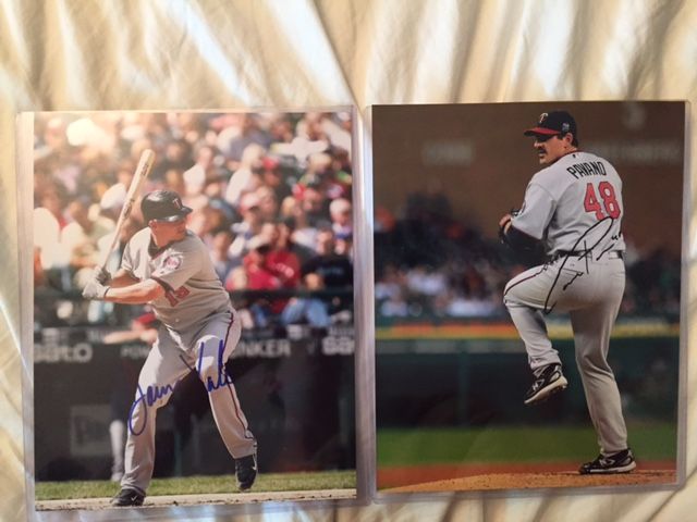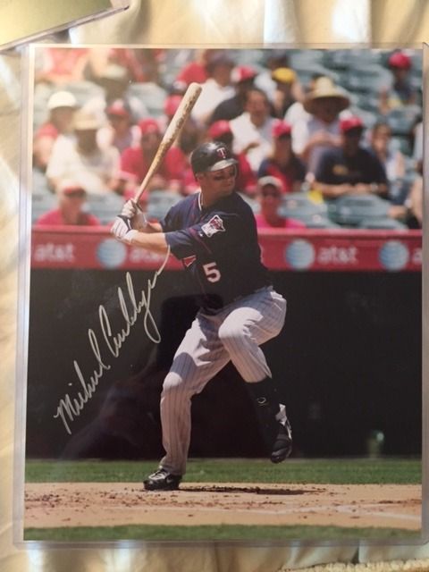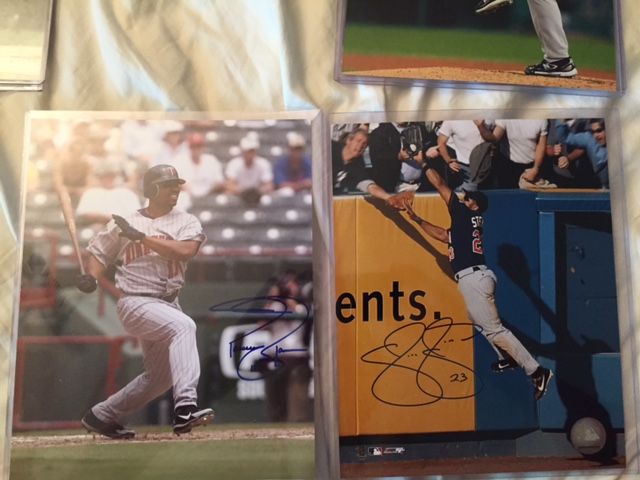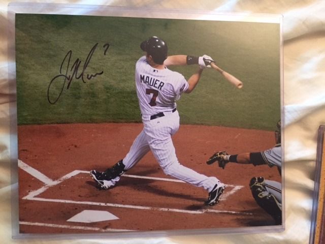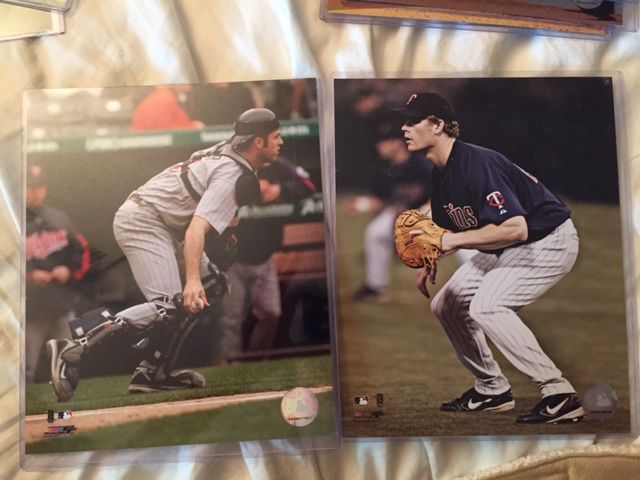 First, is a piece of Metrodome roof. No pic, but kinda cool. Then there was a baseball used in a game between the Twins and the Royals. Actually my first GUed ball in my collection, so thanks sis! The rest are 8x10s- Check them out! Danny Valencia and Carl Pavano signed (both picked pretty bad signing spots...): ![]() Mauer and Morneau unsigned: ![]() Jacque Jones and Shannon Stewart signed: ![]() Then... Michael Cuddyer signed! ![]() Aaaaaand! Joe Mauer signed!! ![]() There we go! Some cool 8x10s to add to the collection! Great free adds to the PC. Thanks, sis!