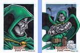 Here's 5 holy grail character/artist pack-inserted sketch card team-ups that I have kept an eye out for: 1) Spider-Man by Stan Lee from 1998 Marvel: The Silver Age. Why? Because it's by Stan Lee! He drew 100 Spidey faces for this set. The only other sketch card by Stan Lee that I've seen is of Captain America from 2006 Complete Avengers, but there is rumor that he has a Sketchagraph in 1997 Fleer Ultra Spider-Man. 2) Doctor Doom by John Romita from 1998 Marvel: The Silver Age. I like Doctor Doom and John Romita is a comic book artist legend. Rumor is that John Romita didn't draw as many Doctor Doom Sketchagraphs as the other characters that he did for this set. 3) "Super Friends" by Tony Perna from 2008 DC Legacy DC Legacy Color Sketch Cards, in Tony#@Perna's DC Legacy Color SketchaFEX Sketch Cards Comic Art Gallery Room - 308484 ![]() I grew up watching the "Super Friends" battling "The Legion of Doom" on Saturday morning cartoons. It's such a cool concept by Tony Perna. 4) Bizarro by Tony Perna from 2013 Superman: The Legend DC Comics 'Superman The Legend' Bizarro Sketch Card, in Tony#@Perna's DC Comics 'Superman The Legend' Sketch Cards Comic Art Gallery Room - 1000361 ![]() I like the backwardness of Bizarro character and Tony Perna does really good sketch card work. I believe this is the first pack-insert Bizzaro sketch card by Tony Perna. Anyone watch the episode "Bizarro Jerry" on "Seinfeld" before? I really enjoy the Bizarro/Superman references in the show. https://m.youtube.com/watch?v=UKfIxNMWiok 5) Any color Doctor Doom by Tony Perna prior to 2010. Again I just like Doctor Doom. I mainly focus on sketch cards prior to 2010 and I enjoy Tony Perna's sketch card work. 2006 Complete Avengers: Doctor Doom SketchaFEX Sketch Card, in Tony#@Perna's Complete Avengers Color SketchaFEX Sketch Cards Comic Art Gallery Room - 238481 ![]() 2008 Fantastic Four Archives: Fantastic Four Archives SketchaFEX Sketch Cards, in Tony#@Perna's Fantastic Four Archives SketchaFEX Sketch Cards Comic Art Gallery Room - 451776 ![]()