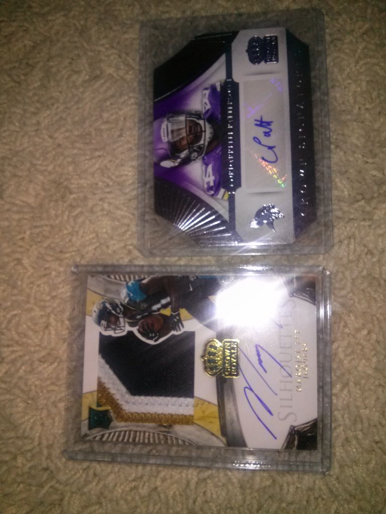 Jersey cards were just one color relics of Darrell Revis and CJ Spiller First auto was a Vet Die Cut auto, that I think you only get about one per case and then the other auto was a Silhouettes auto that only come about 4 per case, so I was pretty pleased Crown Signatures of Cordarrelle Paterson 14/20 Silhouettes RC 4 color Patch Auto 14/35 All are available for sale, just send me a PM with your offer