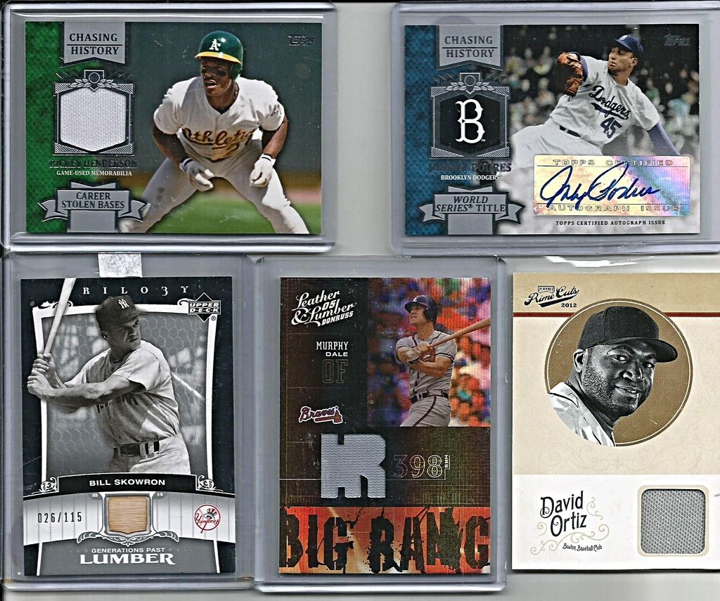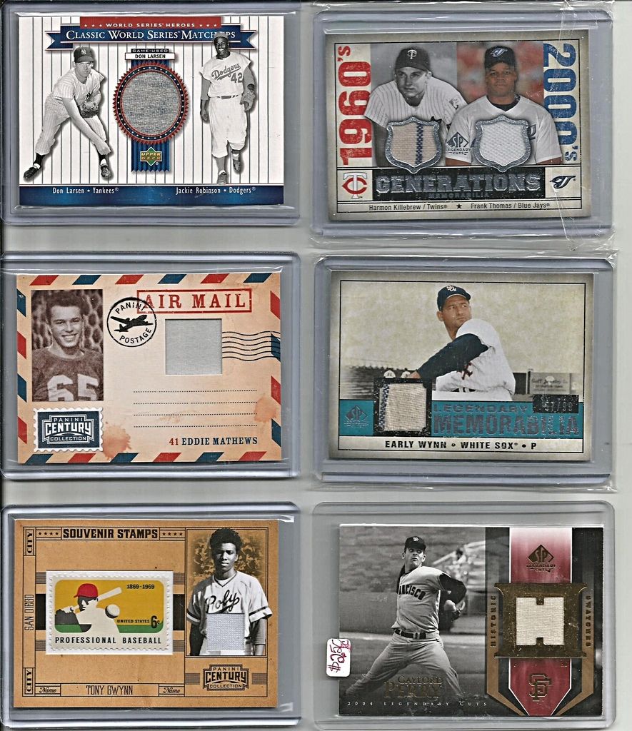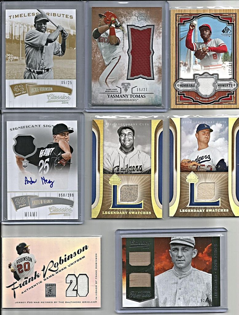 Paypal please - will be adding other cards to this thread in coming hours and days TAKE A LOOK AT THE CARD- IT WILL BE THE EXACT CARD YOU WILL RECEIVE! looking for $105 dlvd on this card. great signature and rare!! ![]() ![]() 2014 classic lineups - Rogers Hornsby/Gabby Harnett/Hack Wilson - $45dlvdSOLD ![]() ![]() 2011 Prime Cuts Nellie Fox Timeline Game Used jersey with 3 Pinstripes #06/25 - $35DLVD ![]() ![]() 2012 SP SIGNATURE SUPERSTARS SIGNATURES TRIPLE #ALLF CARL CRAWFORD/JOSH HAMILTON/JOSH WILLINGHAM #05/25 - $35DLVD 2012 SP Signature Triple Signatures #AZ11 Dan Hudson/Wade Miley/Micah Owings ding in corner - $4 2013 Topps Manufactured Patch #MCP2 Willie Mays BV - $25 - $10dlvd 2008 SP Legendary Cuts Legendary Memorabilia 10 #TR Tim Raines # 06/10(if you need another pic lmk marks ARE ON top loader) - $8 2013 Topps Manufactured Commemorative Patch #CP27 Babe Ruth - $10DLVD ![]() 2002 Upper Deck World Series Heroes Classic Match-Ups larsen gu/jackie robinson - $11 2008 GENERATIONS KILLEBREW/THOMAS DUAL GAME USED - $6 2008 SP Legendary Cuts Legendary Memorabilia 99 #EW Early Wynn - $4 2010 Panini Century Air Mail Jerseys #4 Eddie Mathews/250 - $5 2010 Panini Century Baseball Six Cent Stamp Materials #45 Tony Gwynn/250 - $6 2004 SP Legendary Cuts Historic Swatches #GP Gaylord Perry Jsy - $4 ![]() 2004 Sweet Spot Classic Patch 200 #CA Roy Campanella 49 WS #31/200 - $6 2010 Panini Century Jerseys #89 Warren Spahn #46/250 - $4 2012 Panini National Treasures Greatness Materials #22 Bob Feller #90/99 - $7 2007 Sweet Spot Classic Classic Memorabilia #AK Al Kaline - $4 2010 Panini Century Jerseys #53 Eddie Mathews/250 - $4 2014 Panini National Treasures #56 Pee Wee Reese JSY #23/99 - $10 ![]() 2013 Topps Chasing History Relics #RH Rickey Henderson - $5 2013 Topps Chasing History Autographs #JPO Johnny Podres - $7 2005 Upper Deck Trilogy Generations Past Lumber Silver #SK Bill Skowron/115 - $4 2005 Leather and Lumber Big Bang Jersey #6 Dale Murphy/250 - $4 2012 Prime Cuts #16 David Ortiz Jsy/99 - $4 ![]() JACKIE ROBINSON 2014 PANINI CLASSICS TIMELESS TRIBUTES GOLD PARALLEL DODGERS /25 - $3 YASMANY TOMAS 2015 TOPPS TRIPLE THREADS UNITY JERSEY ROOKIE 15/27 - $4 JOE MORGAN 2006 UD LEGENDARY CUTS GANE USED JERSEY MEMORABLE MOMENTS #064/225 - $3 ANDREW HEANEY 2014 PANINI CLASSICS SILVER ROOKIE JERSEY AUTO MIAMI /299 - $3 ROY CAMPANELLA 2004 UD LEGENDARY CUTS GAME USED JERSEY LEGENDARY SWATCHES - $5 DON DRYSDALE 2004 UD LEGENDARY CUTS GAME USED JERSEY LEGENDARY SWATCHES - $5 FRANK ROBINSON 2002 TOPPS TRIBUTE GAME USED JERSEY #RJ-FR - $8 HEINIE GROH 2014 PANINI CLASSICS DUAL BAT RELIC OCTOBER HEROES /99 - $12