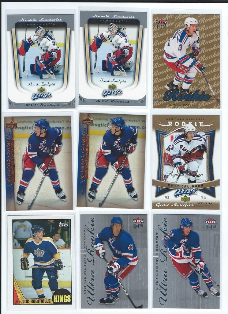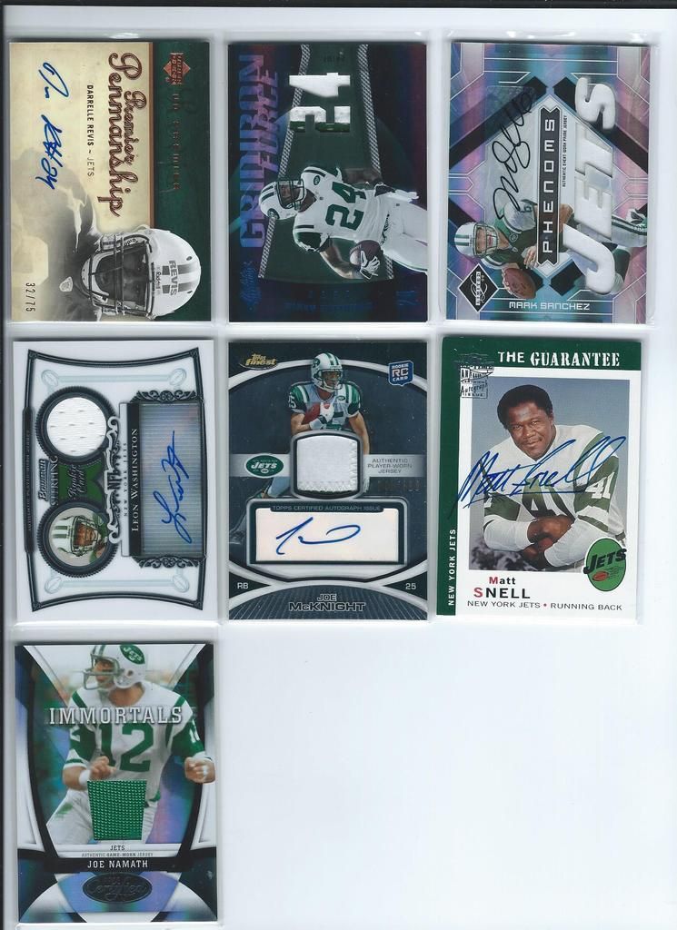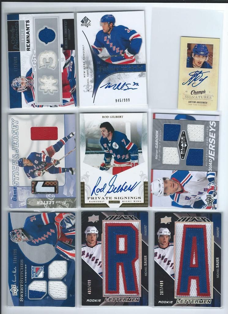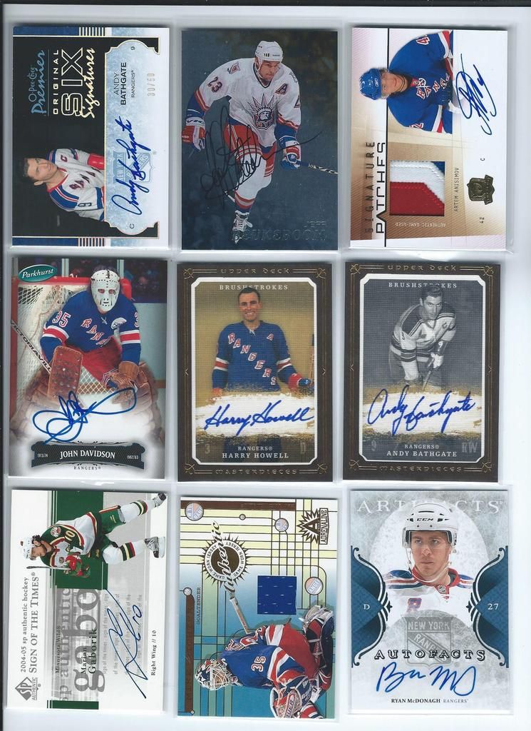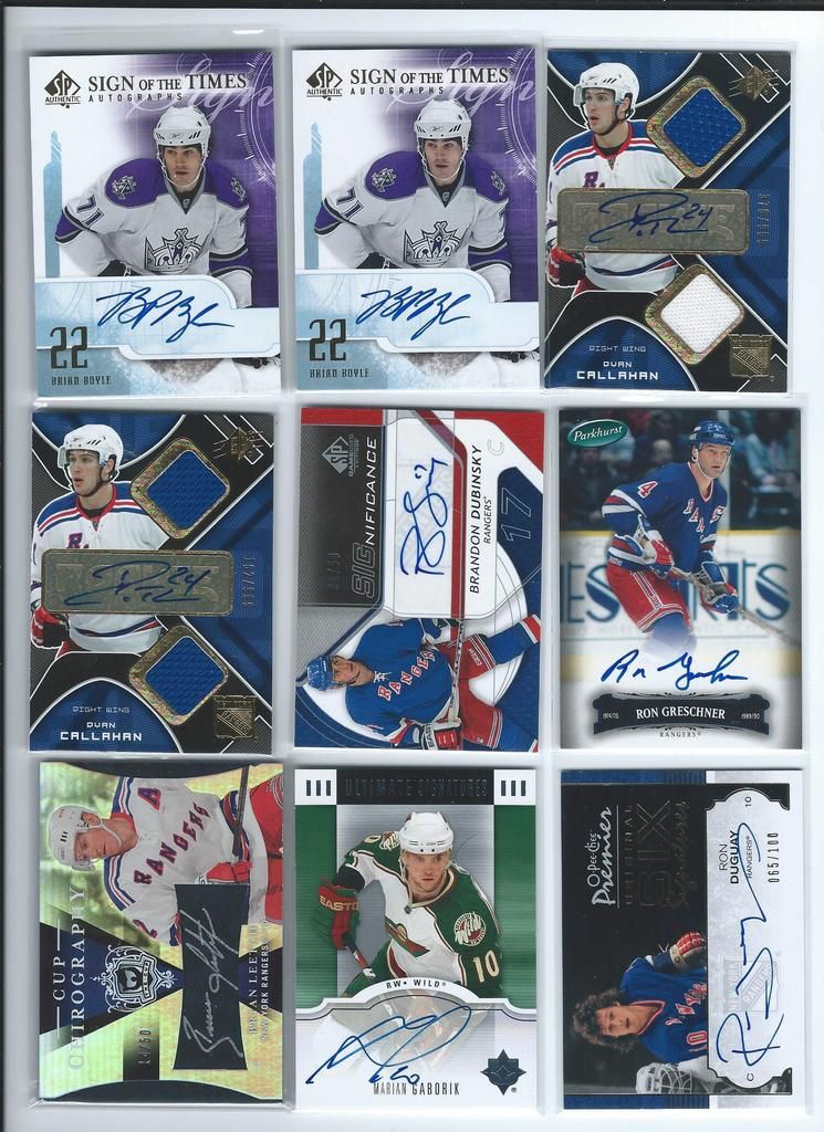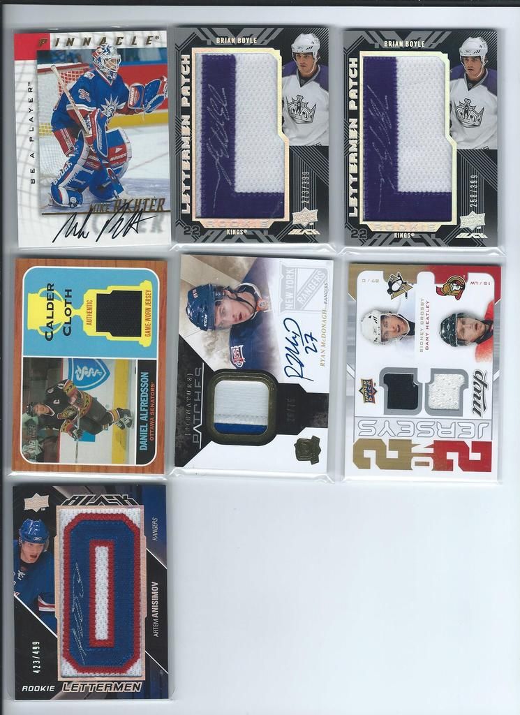Paypal only, shipping to the U.S. only. Shipping will be $2.50 per package (no matter how many cards you buy) The scans follow the list and should be somewhat in the same order. Please claim cards in the thread only. Thanks! P.S. If you look through my bucket, use caution, its almost negligent how out of date it is. BASEBALL 1. 2001 Fleer Greats Gil Hodges Uniform $6 2. 2003 Donruss Signatures Gary Carter Legends Of The Summer Auto $19 3. 2011 Bowman Chrome Brandon Nimmo Auto $16 4. 2003 Topps Archives Ray Knight Auto $7 5. 2003 Topps Archives Wally Backman Auto $8 6. 2005 UD Portraits David Wright Scrapbook Materials $6 7. 2004 Donruss Throwback Threads Duke Snider Jersey 149/250 $7 8. 2008 Bowman Signs Of The Future Daniel Murphy Auto $12 9. 1998 Bowman Todd Helton Auto $18 10. 2002 Fleer Triple Crown Chipper Jones Bat $3 11. 2008 Allen Ginter David Wright Relic $3 12. 2000 UD Legends Of NY Gary Carter Bat $3 13. 2004 Topps Gary Carter Series Stitches Game Worn Jacket Relic $6 14. 2011 Bowman Sterling Brandon Nimmo Auto $5 15. 2003 Topps Chrome Tom Seaver Uniform $4 16. 2005 UD Hall Of Fame Baseball Ralph Kiner Auto 05/15 $18 17. 2001 Fleer Greats Carl Furillo Jersey $11 BASKETBALL 18. 1996-97 Topps/Ultra/Upper Deck Kobe Bryant 3 Card Rookie Lot $15 FOOTBALL 19. 1970 Kellogg’s Dick Butkus #10 PSA 9 $22 20. 1970 Kellogg’s George Sauer #11 PSA 9 $4 21. 1970 Kellogg’s Alex Karras #13 PSA 9 $9 22. 1970 Kellogg’s Matt Snell #29 PSA 9 $5 23. 1970 Kellogg’s Don Maynard #59 PSA 9 $15 24. 2007 UD Premier Darrelle Revis Auto 32/75 $30 25. 2010 Panini Absolute Darrelle Revis Patch 27/50 $9 26. 2009 Limited Mark Sanchez Patch Auto 004/149 $10 27. 2006 Bowman Sterling Leon Washington Jersey Auto $3 28. 2010 Topps Finest Joe McKnight Patch Auto 246/350 $3 29. 2004 Topps Fan Favorite Matt Snell Auto SOLD 30. 2009 Certified Joe Namath Jersey 060/100 SOLD HOCKEY 31. 1967 Topps Harry Howell #84 $35 32. 1968 Topps Rod Gilbert #72 PSA 7 $10 33. 1970 Topps Eddie Giacomin #68 PSA 7 $17 34. 1970 Topps Vic Hadfield #62 PSA 8 $11 35. 1971 Topps Vic Hadfield #9 PSA 8 $9 36. 1972 Topps Rod Gilbert #80 PSA 8 $4 37. 1973 Topps Rod Gilbert #88 PSA 8 $4 38. 1974 Topps Rod Gilbert #201 PSA 8 $4 39. 1975 Topps Rod Gilbert #225 PSA 8 $4 40. 1976 Topps Rod Gilbert #90 PSA 8 $4 41. 1980 Topps Phil Esposito #100 PSA 8 $5 42. 2005-06 MVP Henrik Lundqvist RC $7 Each 43. 2007-08 Ultra Ryan Callahan Gold Medallion RC $4 44. 2007-08 UD Ryan Callahan Young Guns $3.50 Each 45. 2007-08 MVP Ryan Callahan Gold RC 027/100 $5 46. 1987-88 Topps Luc Robitaille RC $3 47. 2009-10 Ultra Michael Del Zotto RC $4 48. 2009-10 Ultra Artem Anisimov RC $2.50 49. 2009-10 UD Tyler Myers Young Guns $2.50 50. 1999-00 UD ICE Jaromir Jagr Quantum 098/100 $10 (small edge peel on bottom) 51. 1999-00 UD Exclusives Alexei Zhamnov 057/100 $4 52. 1999-00 UD Sandis Ozolinsh All-Star Class Quantum 032/100 $4 53. 2009-10 Champs Marian Gaborik Mini Jersey $3 54. 1999-00 UD Prospects Branislav Mezei Auto $3 55. 1999-00 UD Prospects Henrik Sedin Auto $8 56. 1999-00 Topps John LeClair Auto $8 57. 2007-08 O-Pee-Chee Premier Marc Staal Quad Jersey Auto 127/299 $3 58. 2008-09 SP Authentic Brian Boyle SOTT Auto $3 Each 59. 2007-08 UD SPX Ryan Callahan Dual Relic Auto 378/999 $3 60. 2007-08 UD SPX Ryan Callahan Dual Relic Auto 162/999 $3 61. 2008-09 Sp Game Used Brandon Dubinsky Auto 06/50 $5 62. 2006-07 Parkhurst Ron Greshner Auto $4 63. 2007-08 The Cup Brian Leetch Chirography Auto 14/50 $25 64. 2007-08 Ultimate Marian Gaborik Auto $6 65. 2007-08 O-Pee-Chee Premier Ron Duguay Original 6 Auto 065/100 $8 66. 2007-08 O-Pee-Chee Premier Andy Bathgate Original 6 Auto 30/50 $8 67. 1998-99 Be A Player Jeff Beukeboom Auto $4 68. 2009-10 The Cup Artem Anisimov Patch Auto 11/75 $7 69. 2006-07 Parkhurst John Davidson Auto $9 70. 2008-09 UD Masterpieces Harry Howell Auto $6 71. 2008-09 UD Masterpieces Andy Bathgate Auto $10 72. 2004-05 Sp Authentic Marian Gaborik SOTT Auto $5 73. 2002 Pacific Adrenaline Mike Richter Jersey $4 74. 2011-12 UD Artifacts Ryan McDonagh Auto $6 75. 2008-09 O-Pee-Chee Premier Henrik Lundqvist Triple Relic 071/100 $15 76. 2009-10 Sp Authentic Michael Sauer Auto 945/999 $4 77. 2009-10 UD Champs Artem Anisimov Mini Auto $4 78. 2000-01 ITG Be A Player Brian Leetch Stick Jersey Dual Relic $8 79. 2011 Panini Private Signings Rod Gilbert Auto $10 80. 2010-11 UD Black Diamond Marion Gaborik Quad Jersey $5 81. 2007-08 UD Sweet Shot Henrik Lundqvist Triple Jersey 239/299 $5 82. 2009-10 UD Black Michael Sauer Rookie Lettermen “R” 483/499 $3 83. 2009-10 UD Black Michael Sauer Rookie Lettermen “A” 207/499 $3 84. 1997-98 Be A Player Mike Richter Auto $5 85. 2008-09 UD Black Brian Boyle Rookie Lettermen “L” Auto 273/399 $4 86. 2008-09 UD Black Brian Boyle Rookie Lettermen “L” Auto 258/399 $4 87. 2002-03 Topps Heritage Daniel Alfredsson Jersey $5 88. 2010-11 The Cup Ryan McDonagh Patch Auto 25/75 $30 89. 2008-09 UD MVP 2 On 2 Crosby / Heatley / Spezza / Nash Quad Relic $15 90. 2009-10 UD Black Artem Anisimov Rookie Lettermen Auto 423/499 $15 ENTERTAINMENT 91. 2009 Donruss Americana Charlie Daniels Auto 36/50 SOLD 92. 2009 Donruss Americana Taryn Manning Auto 014/100 $4 93. 2008 Marvel Masterpieces Invisible Woman Movie Memorabilia (Jessica Alba) $20 94. 2007 Donruss Americana Jayne Mansfield Shirt $14 95. 2008 Donruss Celebrity Cuts Priscilla Barnes (Three’s Company) Auto 069/200 $25 ![]() ![]() ![]() ![]() ![]() ![]() ![]() ![]() ![]() ![]() ![]() ![]() ![]() ![]() ![]()