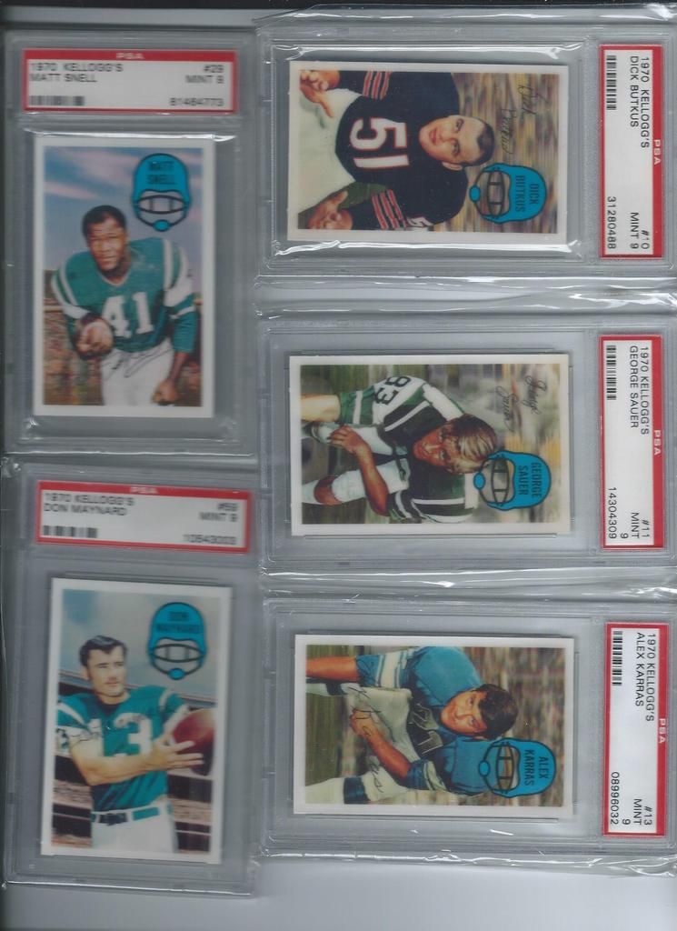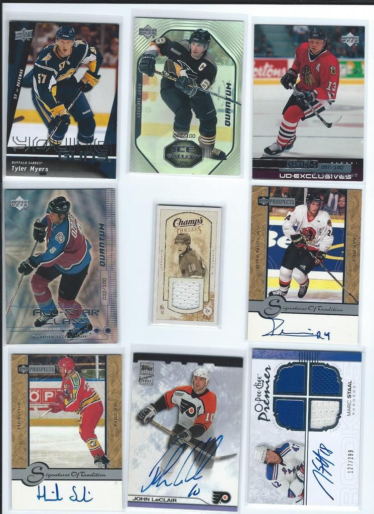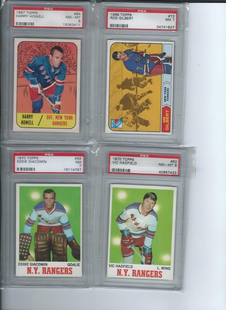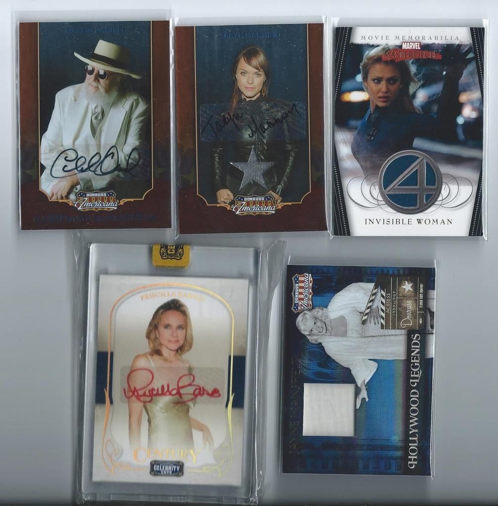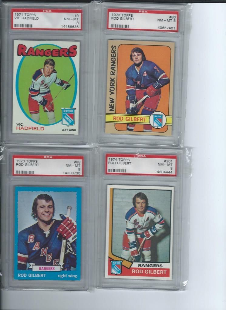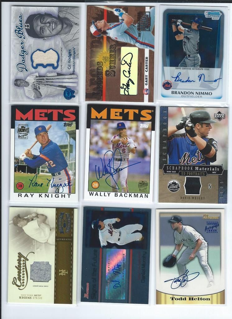 Paypal only, shipping to the U.S. only. Shipping will be $2.50 per package (no matter how many cards you buy) The scans follow the list and should be somewhat in the same order. Please claim cards in the thread only. Thanks! P.S. If you look through my bucket, use caution, its almost negligent how out of date it is. BASEBALL 1. 2001 Fleer Greats Gil Hodges Uniform $6 2. 2003 Donruss Signatures Gary Carter Legends Of The Summer Auto $19 3. 2011 Bowman Chrome Brandon Nimmo Auto $16 4. 2003 Topps Archives Ray Knight Auto $7 5. 2003 Topps Archives Wally Backman Auto $8 6. 2005 UD Portraits David Wright Scrapbook Materials $6 7. 2004 Donruss Throwback Threads Duke Snider Jersey 149/250 $7 8. 2008 Bowman Signs Of The Future Daniel Murphy Auto $12 9. 1998 Bowman Todd Helton Auto $18 10. 2002 Fleer Triple Crown Chipper Jones Bat $3 11. 2008 Allen Ginter David Wright Relic $3 12. 2000 UD Legends Of NY Gary Carter Bat $3 13. 2004 Topps Gary Carter Series Stitches Game Worn Jacket Relic $6 14. 2011 Bowman Sterling Brandon Nimmo Auto $5 15. 2003 Topps Chrome Tom Seaver Uniform $4 16. 2005 UD Hall Of Fame Baseball Ralph Kiner Auto 05/15 $18 17. 2001 Fleer Greats Carl Furillo Jersey $11 BASKETBALL 18. 1996-97 Topps/Ultra/Upper Deck Kobe Bryant 3 Card Rookie Lot $15 FOOTBALL 19. 1970 Kellogg’s Dick Butkus #10 PSA 9 $22 20. 1970 Kellogg’s George Sauer #11 PSA 9 $4 21. 1970 Kellogg’s Alex Karras #13 PSA 9 $9 22. 1970 Kellogg’s Matt Snell #29 PSA 9 $5 23. 1970 Kellogg’s Don Maynard #59 PSA 9 $15 24. 2007 UD Premier Darrelle Revis Auto 32/75 $30 25. 2010 Panini Absolute Darrelle Revis Patch 27/50 $9 26. 2009 Limited Mark Sanchez Patch Auto 004/149 $10 27. 2006 Bowman Sterling Leon Washington Jersey Auto $3 28. 2010 Topps Finest Joe McKnight Patch Auto 246/350 $3 29. 2004 Topps Fan Favorite Matt Snell Auto SOLD 30. 2009 Certified Joe Namath Jersey 060/100 SOLD HOCKEY 31. 1967 Topps Harry Howell #84 $35 32. 1968 Topps Rod Gilbert #72 PSA 7 $10 33. 1970 Topps Eddie Giacomin #68 PSA 7 $17 34. 1970 Topps Vic Hadfield #62 PSA 8 $11 35. 1971 Topps Vic Hadfield #9 PSA 8 $9 36. 1972 Topps Rod Gilbert #80 PSA 8 $4 37. 1973 Topps Rod Gilbert #88 PSA 8 $4 38. 1974 Topps Rod Gilbert #201 PSA 8 $4 39. 1975 Topps Rod Gilbert #225 PSA 8 $4 40. 1976 Topps Rod Gilbert #90 PSA 8 $4 41. 1980 Topps Phil Esposito #100 PSA 8 $5 42. 2005-06 MVP Henrik Lundqvist RC $7 Each 43. 2007-08 Ultra Ryan Callahan Gold Medallion RC $4 44. 2007-08 UD Ryan Callahan Young Guns $3.50 Each 45. 2007-08 MVP Ryan Callahan Gold RC 027/100 $5 46. 1987-88 Topps Luc Robitaille RC $3 47. 2009-10 Ultra Michael Del Zotto RC $4 48. 2009-10 Ultra Artem Anisimov RC $2.50 49. 2009-10 UD Tyler Myers Young Guns $2.50 50. 1999-00 UD ICE Jaromir Jagr Quantum 098/100 $10 (small edge peel on bottom) 51. 1999-00 UD Exclusives Alexei Zhamnov 057/100 $4 52. 1999-00 UD Sandis Ozolinsh All-Star Class Quantum 032/100 $4 53. 2009-10 Champs Marian Gaborik Mini Jersey $3 54. 1999-00 UD Prospects Branislav Mezei Auto $3 55. 1999-00 UD Prospects Henrik Sedin Auto $8 56. 1999-00 Topps John LeClair Auto $8 57. 2007-08 O-Pee-Chee Premier Marc Staal Quad Jersey Auto 127/299 $3 58. 2008-09 SP Authentic Brian Boyle SOTT Auto $3 Each 59. 2007-08 UD SPX Ryan Callahan Dual Relic Auto 378/999 $3 60. 2007-08 UD SPX Ryan Callahan Dual Relic Auto 162/999 $3 61. 2008-09 Sp Game Used Brandon Dubinsky Auto 06/50 $5 62. 2006-07 Parkhurst Ron Greshner Auto $4 63. 2007-08 The Cup Brian Leetch Chirography Auto 14/50 $25 64. 2007-08 Ultimate Marian Gaborik Auto $6 65. 2007-08 O-Pee-Chee Premier Ron Duguay Original 6 Auto 065/100 $8 66. 2007-08 O-Pee-Chee Premier Andy Bathgate Original 6 Auto 30/50 $8 67. 1998-99 Be A Player Jeff Beukeboom Auto $4 68. 2009-10 The Cup Artem Anisimov Patch Auto 11/75 $7 69. 2006-07 Parkhurst John Davidson Auto $9 70. 2008-09 UD Masterpieces Harry Howell Auto $6 71. 2008-09 UD Masterpieces Andy Bathgate Auto $10 72. 2004-05 Sp Authentic Marian Gaborik SOTT Auto $5 73. 2002 Pacific Adrenaline Mike Richter Jersey $4 74. 2011-12 UD Artifacts Ryan McDonagh Auto $6 75. 2008-09 O-Pee-Chee Premier Henrik Lundqvist Triple Relic 071/100 $15 76. 2009-10 Sp Authentic Michael Sauer Auto 945/999 $4 77. 2009-10 UD Champs Artem Anisimov Mini Auto $4 78. 2000-01 ITG Be A Player Brian Leetch Stick Jersey Dual Relic $8 79. 2011 Panini Private Signings Rod Gilbert Auto $10 80. 2010-11 UD Black Diamond Marion Gaborik Quad Jersey $5 81. 2007-08 UD Sweet Shot Henrik Lundqvist Triple Jersey 239/299 $5 82. 2009-10 UD Black Michael Sauer Rookie Lettermen “R” 483/499 $3 83. 2009-10 UD Black Michael Sauer Rookie Lettermen “A” 207/499 $3 84. 1997-98 Be A Player Mike Richter Auto $5 85. 2008-09 UD Black Brian Boyle Rookie Lettermen “L” Auto 273/399 $4 86. 2008-09 UD Black Brian Boyle Rookie Lettermen “L” Auto 258/399 $4 87. 2002-03 Topps Heritage Daniel Alfredsson Jersey $5 88. 2010-11 The Cup Ryan McDonagh Patch Auto 25/75 $30 89. 2008-09 UD MVP 2 On 2 Crosby / Heatley / Spezza / Nash Quad Relic $15 90. 2009-10 UD Black Artem Anisimov Rookie Lettermen Auto 423/499 $15 ENTERTAINMENT 91. 2009 Donruss Americana Charlie Daniels Auto 36/50 SOLD 92. 2009 Donruss Americana Taryn Manning Auto 014/100 $4 93. 2008 Marvel Masterpieces Invisible Woman Movie Memorabilia (Jessica Alba) $20 94. 2007 Donruss Americana Jayne Mansfield Shirt $14 95. 2008 Donruss Celebrity Cuts Priscilla Barnes (Three’s Company) Auto 069/200 $25 ![]() ![]() ![]() ![]() ![]() ![]() ![]() ![]() ![]() ![]() ![]() ![]() ![]() ![]() ![]()