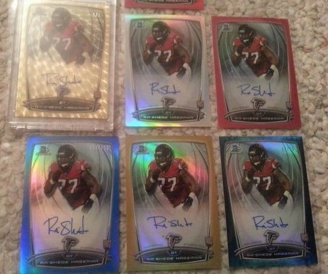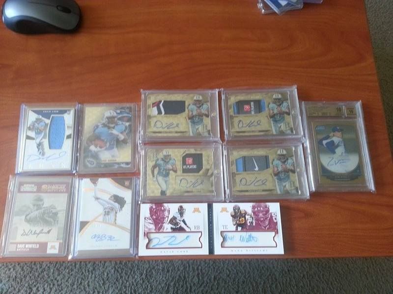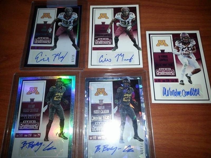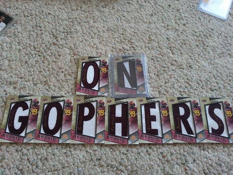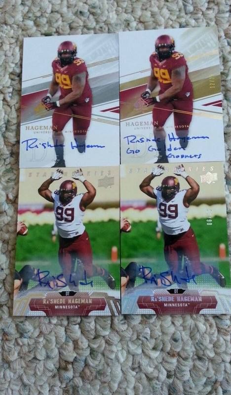 Leaf: Draft: Autos: Magenta Plate 1/1, Yellow Plate 1/1, Black Plate 1/1 ![]() Valiant: Autos: Orange 11/99, Gold 3/10, Green, Purple 19/25, Black 2/5, Cyan Plate 1/1, Black Plate 1/1 ![]() Panini: Certified: Camo: Black 1/1, Gold 17/25 Mirror: Green 1/5, Green 4/5, Gold 21/25 ![]() Contenders: Autos: Base SP, Cracked Ice 4/22, Championship 38/99, Playoff 133/199, Magenta Plate 1/1, Yellow Plate 1/1, Cyan Plate 1/1 ![]() Crown Royale: Autos: Red 1/25, Red Plaid 14/14, Copper 6/99, Purple Panini 11/14, Orange plaid 1/10, Orange #77 1/77, Gold 6/15, Gold 3/25, Silver 14/35, Green 5/5, Blue 1/1, Purple 3/10 and 1/10, Black plaid 1/1, Blue plaid 1/5 2/5 3/5 4/5 5/5, Cyan Plate 1/1 ![]() Elite: Autos: Black 1/1, Red Status 10/49, Green TOTC 38/99, Gold Status77/199 Rainbow Complete 4 of 4 Base: Aspirations 5/23, Status 44/77 46/77, Yellow Plate 1/1, Magenta Plate IP 1/1, Black Plate 1/1 ![]() Limited: Autos: Gold 63/99 ![]() Playbook: Autos: Black 1/1, Green 1/5, Blue 11/25, Silver 1/99 ![]() Prestige: Autos: Red, Black Plate IP 1/1 Base: Base ![]() Prizm: Autos: Pink /25, Red NFL /25 x2, Red Power /35, Red /75, Red White Blue /100, Tie Dye /25, Panini Gold /50, Neon /50, Camo /50, Blue Team /25, Orange /50, Gold /10, Green /60, Blue /75, Purple /40, Light Blue Wave /35, Ref, Base, Black 1/1. Rainbow complete 19 of 19 ![]() Rookies and Stars: Autos: Red ![]() Score: Autos: Black 3/15, Red 20/75, Blue 48/99, Orange 12/20, Cyan Plate IP 1/1 Base: Black Plate, Magenta Plate, Gem Mesters 1/1 ![]() Select: Autos: Black 1/1, Red 1/50, Magenta Pink 57/199, Orange 17/35, Blue Mojo 6/10 7/10, Red Mojo 4/15 9/15 ![]() Totally Certified: Autos: Green 1/5 4/5 Base: Green 1/1 ![]() Press Pass: Autos: Base, Gold 30/99, Red ink, Showbound Purple 5/50 ![]() Sage: Hit: Autos: Black, Red, Red 25/99, Cyan Plate 1/1, Yellow Plate IP 1/1, Black Plate IP 1/1, Cyan Plate IP 1/1 ![]() Base: Silver foil Squared: Autos: Clowney 6/25, Matthews 3/50 ![]() Topps: Bowman College: Autos: Prizm 4/5, XFractor 5/10 10/10, Red 7/25, Orange 23/50, Gold 62/75, Blue 13/99, Base x2, Cyan Plate 1/1, Black Plate 1/1, Yellow Plate 1/1, Magenta Plate 1/1 Plate Rainbow complete 4 of 4 ![]() Base: Red 129/199, Gold 354/399, Green Foil 9/99, Purple, Silver Ice, Black Foil, Black Base, White Base, Cyan Plate 1/1, Black Plate 1/1, Yellow Plate 1/1, Green Foil 1/1, Green Ice 1/1, Blank Back 1/1 ![]() Bowman Chrome: Autos: Superfractor 1/1, Red 25/25, Gold 2/50, Green 98/99, Blue 54/199 ![]() Base: Prizm 3/5, Red 10/25 11/25, Black Plate 1/1 ![]() Flagship: Black Plate 1/1, Purple ![]() Sterling: Base: Magenta Plate 1/1 ![]() Strata: Base: Base, Orange 84/99, Gold 146/150, Cyan Plate 1/1 ![]() Topps Chrome: Mini: Superfractor 1/1, Red 3/5, Gold 9/10, Pink 6/25, Cyan Plate 1/1 ![]() Regular: Green x4, Blue Wave x3, Gold 23/50, Blue 23/199 72/199, Pink 122/399 235/399, Pulsar x4, XFractor, Ref x10ish, Base x100ish, Cyan Plate 1/1, Black Plate 1/1 ![]() Turkey Red: Base: Cyan Plate 1/1 ![]() Upper Deck: Flagship: Autos: Base, Silver 4/10 6/10 ![]() Letterman: Autos: G 3/50, O 33/50, P 42/50, H 10/50, E 22/50, R 7/50, S 27/50, O 23/50, N 33/50 ![]() SP Authentic: Autos: Base, Gold 12/25 "Go Golden Gophers" inscription Memorabilia: Gophers Mini Helmet Auto
