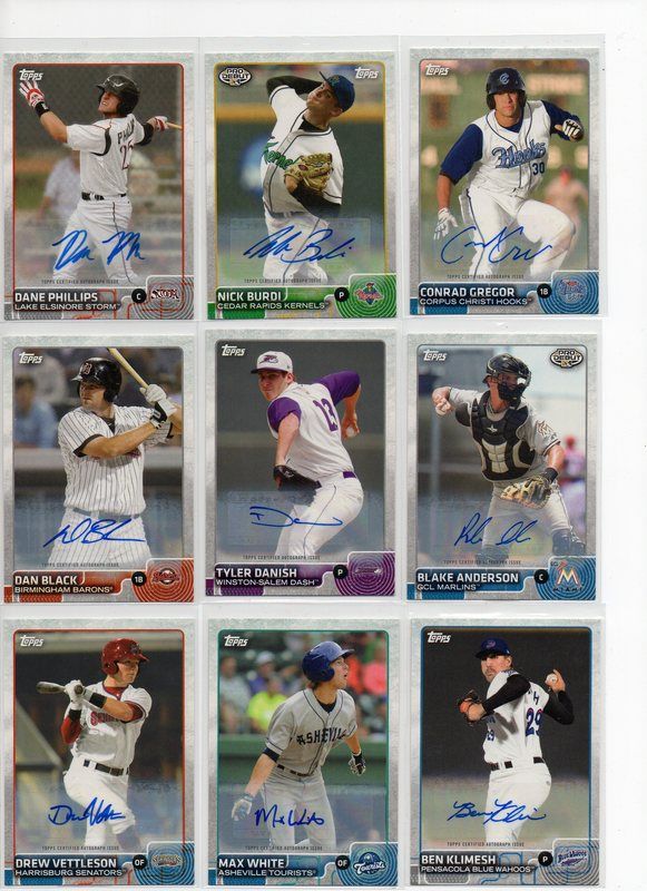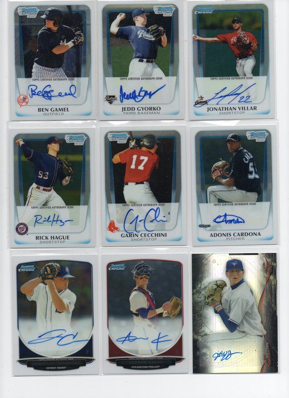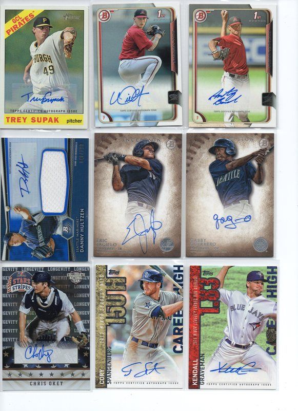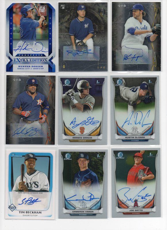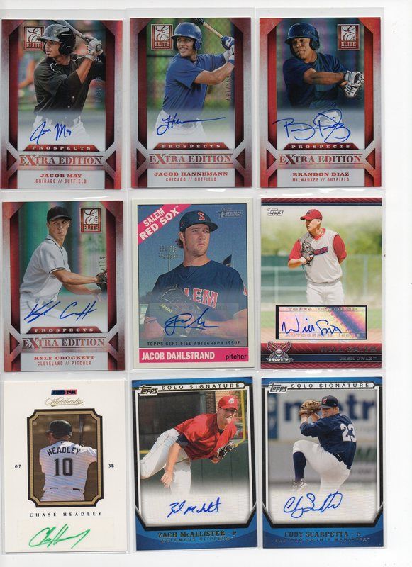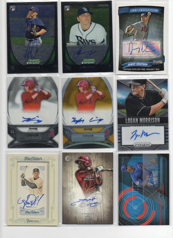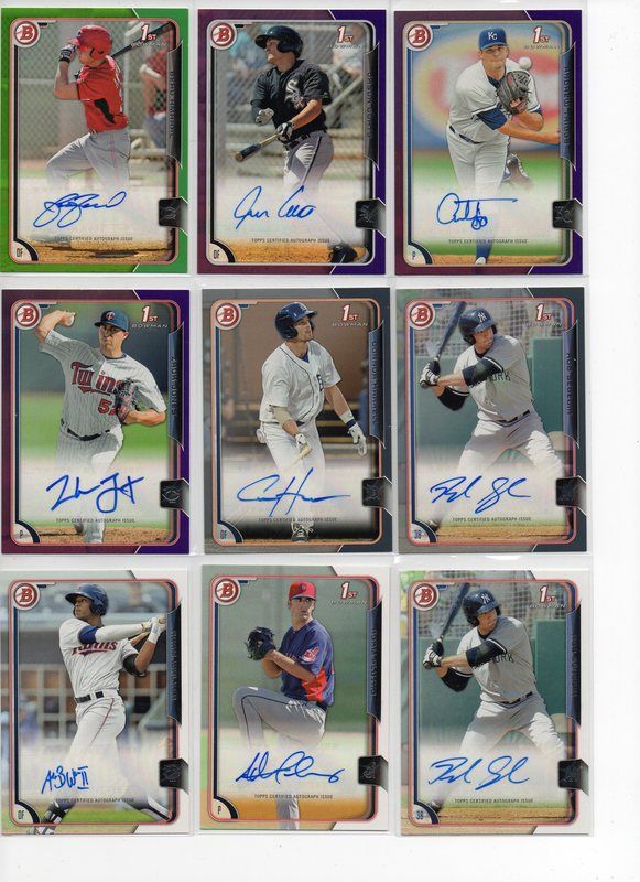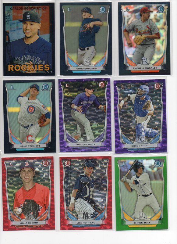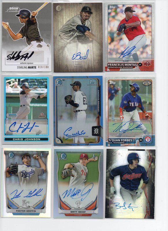 $2.50 Shipping no matter how many you buy, unless you buy $30 worth then shipping is free. Claim in thread and PM me for Paypal info. I like to do free shipping but with cards this cheap I really can't unless you buy so much. Prices listed UNDER scans in order from left to right as they appear in the thread and all are numbered 1-99 for quick reference. I try to make a note of which cards are Refractors, SPs, or numbered. Lets have some fun and buy some cheap cards. Cards are all in the shape they were in when I pulled them or obtained them in local trades, I don't grade cards so they are not cherry picked. All cards are in nice shape I am not listing any damaged cards I picked a couple out that were messed up. Just started iTrading a few weeks ago, check my eBay feedback as reference almost 1,000 Positive Feedbacks and one Neg from a guy who doesn't speak English all that well. ![]() 1. Starling Marte 2011-12 Just Limited /100 Auto RC: $10 2. Eddie Butler Bowman Inception Auto: $2 3. Francelis Montas 2015 Topps Pro Debut Auto: $3.50 4. Chris Johnson 2009 Bowman Chrome Ref Auto /500: $8 5. Endrys Briceno 2015 Bowman Chrome Twitter Light Blue Ref Auto #1/3: $15 6. Ti'Quan Forbes 2015 Topps Pro Debut Auto: $2.50 7. Foster Griffin 2014 Draft Ref Auto: $5 8. Matt Imhof 2014 Draft Ref Auto: $2.50 9. Bradley Zimmer 2014 Sterling Ref /150: $10 ![]() 10. Ben Gamel 2011 Chrome Auto: $12 11. Jedd Gyorko 2011 Chrome Auto: $6 12. Jonathan Villar 2011 Chrome Auto: $2 13. Rick Hague 2011 Chrome Auto: $1.50 14. Garin Cecchini 2011 Chrome Auto: $6 15. Adonis Camarona 2011 Chrome Auto: $1.25 16. Jonathan Crawford 2013 Draft Auto: $3 17. Andrew Knapp 2013 Draft Auto: $8 18. Jeff Hoffman 2014 Sterling Ref /150: $4 ![]() 19. Hunter Dozier 2013 EEE Status Die Cut Auto /50: $8 20. Jimmy Nelson 2014 Sterling Auto: $1.50 21. Brandon Finnegan 2014 Sterling Auto: $2.50 22. Delino DeShields Jr 2014 Sterling Auto: $1.50 23. Aramis Garcia 2014 Draft Auto: $1.50 24. Austin DeCarr 2014 Draft Auto: $3 25. Tim Beckham 2011 Bowman Auto: $2 26. Cameron Varga 2014 Draft Auto: $2 27. Joe Gatto 2014 Draft Auto: $3 ![]() 28. Beau Amaral 2015 Bowman Green Paper Auto /99: $9 29. Jason Coats 2015 Bowman Purple Paper Auto /250: $2 30. Andrew Triggs 2015 Bowman Purple Paper Auto /250: $6 31. Zack Jones 2015 Bowman Purple Paper Auto /250: $2 32. Connor Harrell 2015 Bowman Silver Paper Auto /499: $3 33. Rob Segedin 2015 Bowman Silver Paper Auto /499: $6 34. Adam Walker 2015 Bowman Paper Auto: $5 35. Adam Plutko 2015 Bowman Paper Auto: $3 36. Rob Segedin 2015 Bowman Paper Auto: $3 ![]() 37. Dillon Gee 2011 Bowman Chrome Auto: $3 38. Jake McGee 2011 Bowman Chrome Auto: $2 39. Jonny Venters 2010 Update Peek Performance Auto: $2 40. Taylor Lindsey Sterling Auto: $2 41. Taylor Lindsey Sterling Gold Auto /50: $5 42. Logan Morrison Prizm Auto: $3 43. Avasail Garcia Allen & Ginter Framed Mini RC Auto: $7 44. Phil Ervin 2014 Inception Auto: $3 45. Arismendy Alcantara 2014 Update Trajectory Auto: $3 ![]() 46. Braxton Davidson Pro Debut Gold Auto /50: $8 47. Scott Sizemore 2010 Topps Chrome Auto RC: $1 48. Tyson Ross 2010 Topps Chrome Auto RC: $2 49. Kennys Vargas 2015 Tier One Auto: $1.50 50. Travis Demeritte 2014 Inception Blue Auto /75: $5 51. Jordan Swagerty Platinum Auto RC: $3 52. BJ Upton Upper Deck AU RC: $3 53. Bradley Zimmer 2015 Bowman Chrome Twitter #10/10 Light Blue Ref (light scratch): $10 54. Brandon Drury 2015 Bowman Chrome Twitter Light Blue Ref /10 : $14 ![]() 55. Jacob May 2013 EEE Auto: $2 56. Jacob Hannemann 2013 EEE Auto: $5 57. Brandon Diaz 2013 EEE Auto: $4 58. Kyle Crockett 2013 EEE Auto: $2 59. Jacob Dahlstrand Heritage Minors Auto: $2 60. Will Smith 2010 Pro Debut Auto: $2 61. Chase Headley Blue Foil /250 Tristar AU Prospect: $4 62. Zach McAllister 2011 Pro Debut Gold Auto /50: $5 63. Cody Scarpetta 2011 Pro Debut Auto: $1 ![]() 64. Trey Supak Heritage Minors Auto: $2 65. Will Locante 2015 Bowman Paper Auto: $1 66. Anthony Banda 2015 Bowman Paper Auto: $3 67. Danny Hultzen Platinum Blue Ref Auto Jersey /199: $15 68. Eric Jagielo 2015 Inception Auto: $1.50 69. Gaby Guerrero 2015 Inception Auto: $1.50 70. Chris Okey Stars & Stripes Auto /299: $4 71. Cory Spangenberg 2015 Topps Series 2: $2.50 72. Kendall Graveman 2015 Topps Series 2: $3 ![]() 73. Dane Phillips 2015 Pro Debut Auto: $2 74. Nick Burdi 2015 Pro Debut Auto: $2 75. Conrad Gregor 2015 Pro Debut Auto: $2 76. Dan Black 2015 Pro Debut Auto: $2 77. Tyler Danish 2015 Pro Debut Auto: $1.50 78. Blake Anderson 2015 Pro Debut Auto: $2 79. Drew Vettleson 2015 Pro Debut Auto: $1 80. Max White 2015 Pro Debut Auto: $2 81. Ben Klimesh 2015 Pro Debut Auto: $2 ![]() 82. Carlos Gonzalez 2016 Heritage Black /67: $6 83. Chad Sobotka 2014 Draft Black Ref /75: $4 84. Andrew Morales 2014 Draft Black Ref /75: $3 85. Jake Stinnett 2014 Draft Black Ref /75: $4 86. Forrest Wall 2014 Draft Purple Ice /99: $3 87. Chase Vallot 2014 Draft Purple Ice /99: $2 88. Jake Cosart 2014 Draft Red Ice /150: $2 89. Luis Torrens 2014 Draft Red Ice /150: $2 90. Shane Zeile 2014 Draft Green Ref /150: $1.25 ![]() 91. Chase Vallot 2014 Draft Auto: $3 92. Derek Hill 2014 Draft Auto: $4 93. Marcus Wilson 2014 Draft Auto: $1.50 94. Foster Griffin 2014 Draft Auto: $2 95. Brandon Drury Pro Debut Gold /50: $2 96. Corey Littrell 2015 Bowman Green Ref /99: $2 97. Jake Johansen 2015 Bowman Purple Ref /250: $2 98. Roman Quinn 2015 Bowman Purple Ref /250: $2 99. Dermis Garcia 2015 Bowman Purple Ref /250: $3 ![]() Trout Lot Includes 2013 Topps Retail Blue Border Rookie Cup: $12 Last edited by ericg531; 05-01-2016 at 07:47 PM. Reason: Changed title, adding cards |