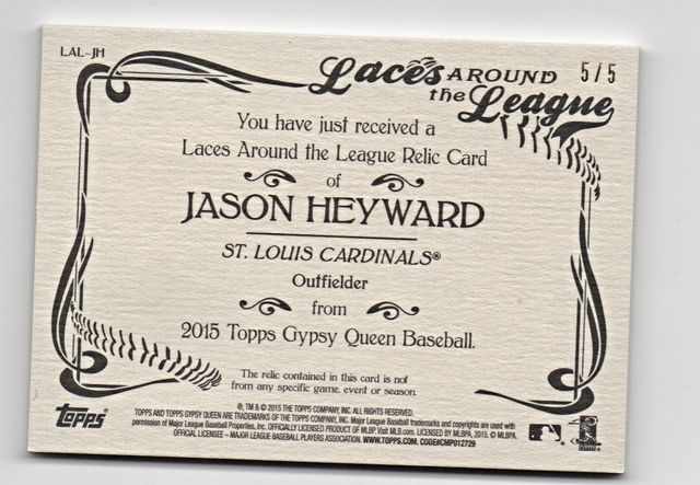 Selling a 2015 Gypsy Queen Jason Heyward Laces Around The League Game-Used Baseball 5/5. Unlike this year with no MLB hologram, this one lets you know it was used in a game against the Giants. Heyward hit a 1st inning single against Tim Lincecum. Asking $225 OBO, this years are selling from low end of $180 to as high as $650.