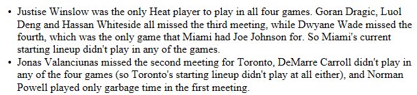 I think the Heat and Raptors are very evenly matched across the board with the exception of Whiteside. Should be an awesome series and I can definitely see it going 7 games with the Raptors pulling it out at home.